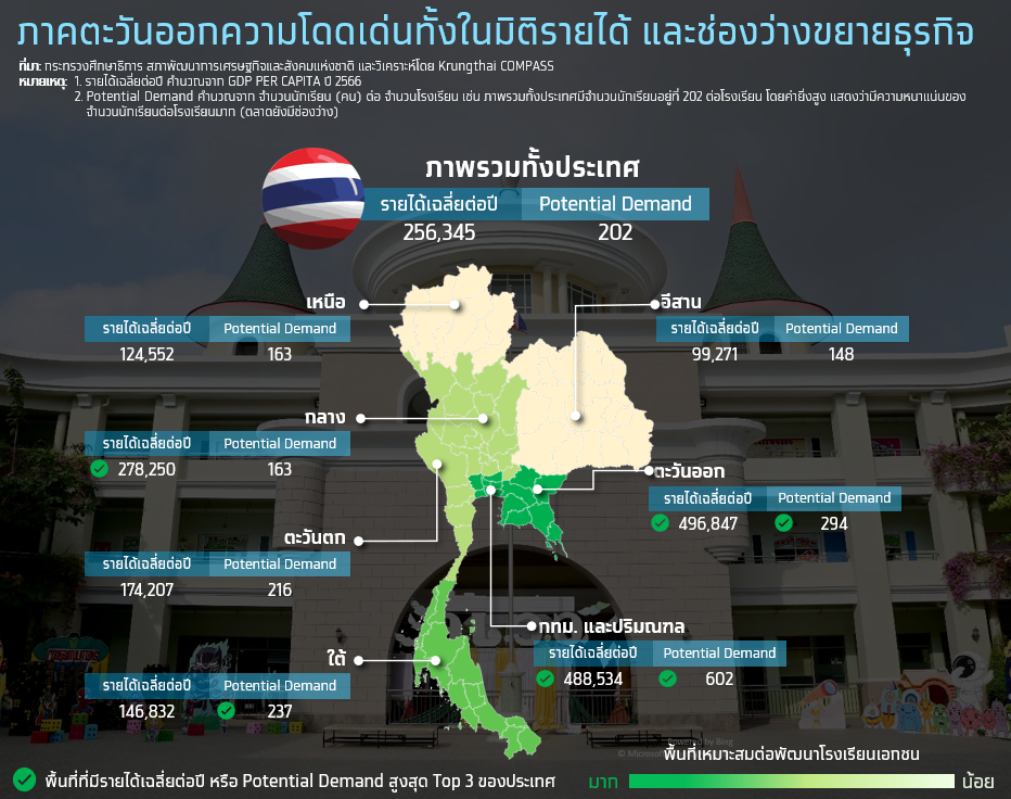 หากประเมินโอกาสในการขยายธุรกิจโรงเรียนเอกชนผ่าน 2 ตัวชี้วัด คือ 1) รายได้เฉลี่ยของประชากร (วัดกำลังซื้อในแต่ละภูมิภาค) และ 2) สัดส่วนจำนวนนักเรียนต่อโรงเรียน (วัด Potential Demand จากความหนาแน่นของจำนวนนักเรียนในแต่ละภูมิภาค) พบว่าภาคตะวันออก โดยเฉพาะ EEC โดดเด่นมากที่สุด