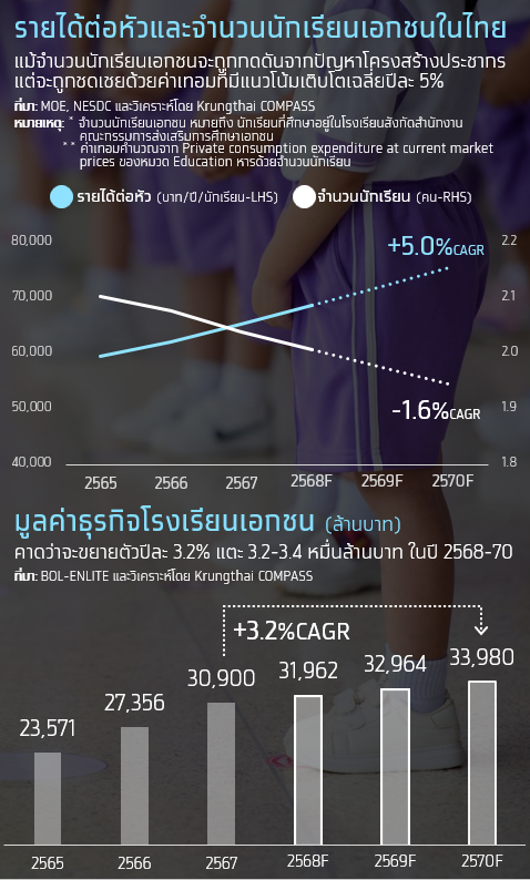 Krungthai COMPASS ประเมินมูลค่าธุรกิจโรงเรียนเอกชนในปี 2568-70 ว่าจะอยู่ในระดับ 3.2-3.4 หมื่นล้านบาท ขยายตัวปีละ 3.2% แต่ถือว่าชะลอตัวลงจากในอดีต ตามแรงกดดันของ Aging Population โดย การเติบโตจะมาจากการเพิ่มรายได้ต่อนักเรียนเป็นหลัก ทั้งการเพิ่มหลักสูตรพิเศษ หรือการขยายบริการเสริมรอบตัวนักเรียน