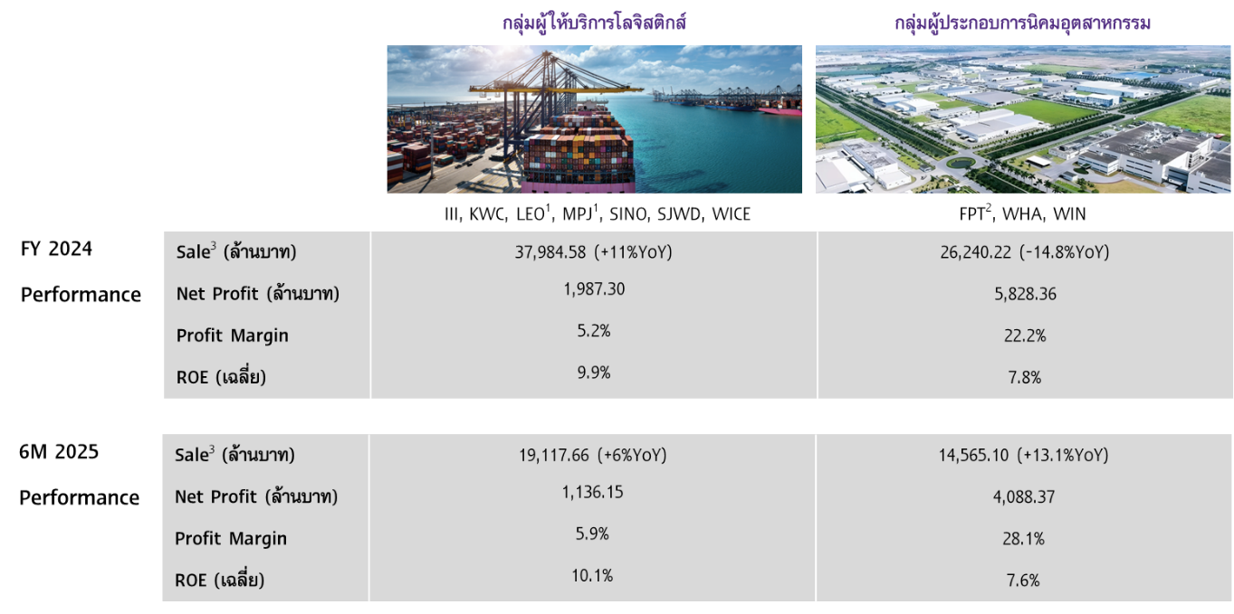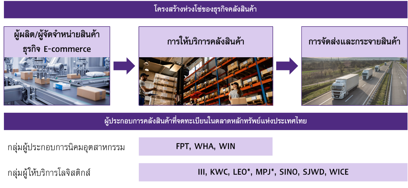 สำหรับธุรกิจให้บริการคลังสินค้าที่จดทะเบียนในตลาดหลักทรัพย์แห่งประเทศไทย สามารถจำแนกได้เป็น 2 กลุ่มหลัก ประกอบด้วย 1. กลุ่มผู้ให้บริการโลจิสติกส์ ได้แก่ III, KWC, LEO, MPJ,SINO, SJWD และ WICE ซึ่งให้บริการด้านโลจิสติกส์ครบวงจร ตั้งแต่การจัดเก็บและบริหารจัดการสินค้าภายในคลัง บริการขนส่งสินค้า รวมถึงบริการอื่น ๆ เช่น การบรรจุภัณฑ์ และ 2. กลุ่มผู้ประกอบการนิคมอุตสาหกรรม ได้แก่ FPT, WHA และ WIN ซึ่งเน้นให้บริการพื้นที่จัดเก็บและบริหารจัดการสินค้าภายในคลังสินค้า ส่วนใหญ่ตั้งอยู่ในพื้นที่นิคม/เขต/สวนอุตสาหกรรม โดยคลังสินค้าของผู้ให้บริการทั้ง 2 กลุ่ม ครอบคลุมทั้งคลังสินค้าแบบ Ready-Built และคลังสินค้าแบบ Built-to-Suit ซึ่งส่วนใหญ่จะเสนอบริการด้านเทคโนโลยีทันสมัยที่ช่วยเพิ่มประสิทธิภาพในการบริหารจัดการสินค้าภายในคลังสินค้าด้วย