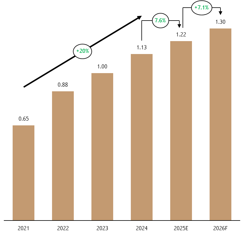 ในช่วงปี 2021-2024 พื้นที่คลังสินค้าที่มีสัญญาเช่าเติบโตราว 7%CAGR ตามการขยายตัวของตลาด E-commerce รวมถึงการเติบโตของการบริโภคภาคเอกชนและการนำเข้า/ส่งออก โดย 1) ธุรกิจ E-commerce เติบโตสูงถึง 20%CAGR จากพฤติกรรมผู้บริโภคที่นิยมซื้อสินค้าผ่านช่องทางออนไลน์ที่เพิ่มขึ้นอย่างต่อเนื่อง 2) การบริโภคภาคเอกชนที่ฟื้นตัวและการกลับมาของจำนวนนักท่องเที่ยวต่างชาติที่เดินทางมาท่องเที่ยวในไทยช่วยกระตุ้นความต้องการสินค้าอุปโภคบริโภคให้เพิ่มสูงขึ้น และ 3) การนำเข้า/ส่งออกที่เติบโต ซึ่งช่วยหนุนความต้องการพื้นที่จัดเก็บและกระจายสินค้าโดยเฉพาะในเขตอุตสาหกรรม