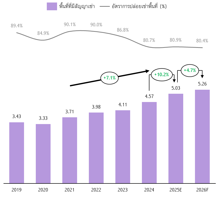ปริมาณพื้นที่คลังสินค้าที่มีสัญญาเช่ามีแนวโน้มเติบโตต่อเนื่อง 10.2%YOY มาอยู่ที่ราว 5.03 ล้านตารางเมตรในปี 2025 และคาดว่าจะเติบโตในอัตราชะลอตัวลงที่ 4.7%YOY ในปี 2026 มาอยู่ที่ราว 5.26 ล้านตารางเมตร โดยความต้องการใช้งานพื้นที่คลังสินค้ามีแนวโน้มเพิ่มขึ้นจาก 1) การเริ่มเดินสายการผลิตของโรงงานที่กระจายฐานการผลิตมาไทยในช่วงปี 2022-2024 ทำให้เกิดความต้องการพื้นที่จัดเก็บวัตถุดิบ ชิ้นส่วนประกอบ และสินค้าสำเร็จรูป 2) การนำเข้าและส่งออกของไทยในปี 2025 ที่คาดว่าเติบโต 5.5%YOY และ 5.3%YOY ตามลำดับ แต่มีแนวโน้มหดตัวลงในปี 2026 จากผลของมาตรการภาษีของสหรัฐฯ ที่จะส่งผลกระทบต่อเศรษฐกิจโลกชัดเจนขึ้น อย่างไรก็ดี การเร่งระบายสินค้าส่วนเกินของผู้ผลิตในจีนมาไทย (China Influx) ที่มีแนวโน้มเพิ่มขึ้น ยังคงเป็นปัจจัยหนุนต่อความต้องการพื้นที่คลังสินค้าให้ยังคงขยายตัวได้ และ 3) ตลาด E-commerce ที่ยังมีทิศทางเติบโตต่อเนื่องตามพฤติกรรมผู้บริโภคที่คุ้นชินกับการซื้อสินค้าผ่านช่องทางออนไลน์และการแข่งขันกับช่องทางออฟไลน์ด้วยการส่งสินค้าที่รวดเร็วขึ้น อีกทั้ง นโยบายคนละครึ่งพลัสของภาครัฐที่มีกำหนดเริ่มใช้ในช่วงปลายเดือนตุลาคมนี้จะเป็นส่วนหนึ่งที่เข้ามาช่วยกระตุ้นการใช้จ่ายภาคเอกชนในช่วงปลายปี 2025 ในขณะที่ปริมาณพื้นที่คลังสินค้าตามแผนของผู้ให้บริการรายเดิมและการเข้าสู่ตลาดของผู้ให้บริการรายใหม่ มีแนวโน้มเพิ่มขึ้น 9.9%YOY อยู่ที่ 6.22 ล้านตารางเมตร ในปี 2025 และขยายตัวที่ 5.3%YOY มาอยู่ที่ 6.55 ล้านตารางเมตรในปี 2026 เพื่อรองรับแนวโน้มความต้องการพื้นที่คลังสินค้าที่ยังมีโอกาสเติบโตได้ต่อเนื่องในระยะข้างหน้า โดยส่วนใหญ่เป็นการพัฒนาคลังสินค้าแบบ Built-to-Suit (รูปแบบคลังสินค้าที่ออกแบบและก่อสร้างตามความต้องการเฉพาะของผู้เช่าแต่ละราย) ซึ่งทำสัญญาเช่าระยะยาวล่วงหน้าก่อนเริ่มการก่อสร้าง จึงทำให้อัตราการปล่อยเช่าพื้นที่คลังสินค้าใกล้เคียงกับปีก่อนหน้าอยู่ที่ 80.9% ในปี 2025 และ 80.4% ในปี 2026