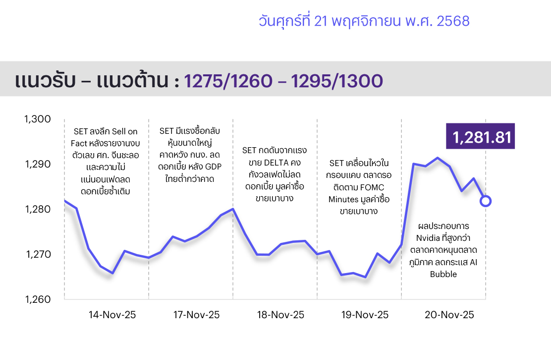 คาดการแกว่งขึ้นของตลาดยังจำกัด/พักตัว แต่หากมีการยุบสภาเร็วจะกลับมาเป็นปัจจัยบวกในระยะสั้น ประเด็นการขึ้น VAT ในปี 2571 ถูกปฏิเสธและไม่กดดันตลาด ตัวเลข NFPs สหรัฐฯ ดีกว่าคาด แต่อัตราการว่างงานกลับสูงขึ้น ตลาดประเมินมีความเป็นไปได้ที่จะลดดอกเบี้ยเพิ่มขึ้น หุ้นสหรัฐฯ ตอบสนองเชิงบวกสั้นก่อนกลับมาลง ติดตามเงินเฟ้อ PCE สหรัฐฯ ทางเทคนิค หากยังไม่สามารถยืนเหนือ 1295/1300 ยังเป็นเพียงรีบาวด์ แนวรับไม่ควรหลุดอยู่ที่ 1275/1260
