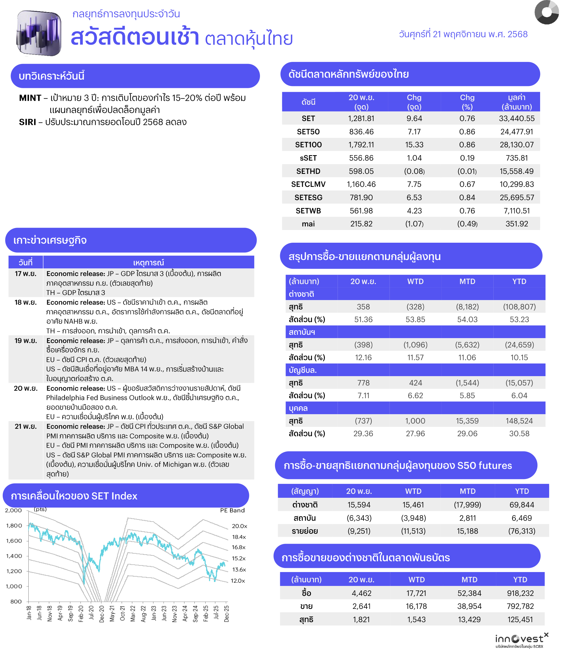 MINT: คาดได้อานิสงส์จากมาตรการกระตุ้นการท่องเที่ยวของรัฐบาล และมองประเด็นความขัดแย้งระหว่างจีนและญี่ปุ่นจะหนุนการท่องเที่ยวประเทศอื่นรวมถึงไทยในระยะสั้น บริษัทตั้งเป้าหมายกําไรเติบโต 15–20% ต่อปีในระยะ 3 ปีข้างหน้า และการ IPO ธุรกิจร้านอาหาร Minor Food ในปี 2569 เป้าหมายระยะสั้น 21.00 บาท