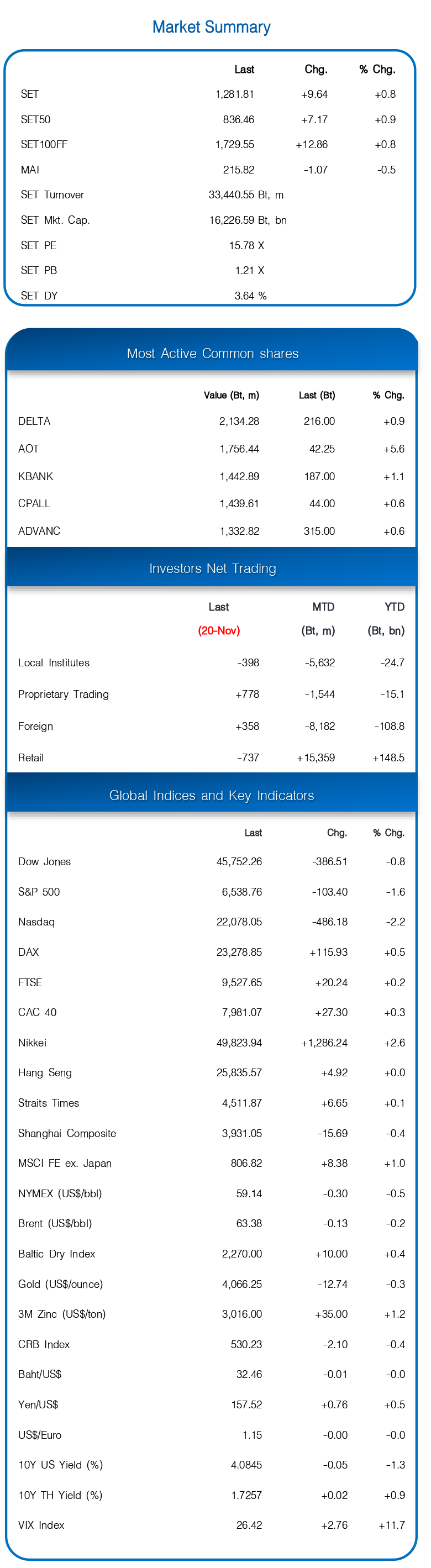 ปิดสวนทางกัน – หุ้นยุโรปปิดบวกไปก่อนขานรับงบ Nvidia แข็งแกร่ง แต่หุ้นสหรัฐฯ พลิกปิดลบหนักตามหุ้น Nvidia ถอยจน -3% กังวลมูลค่าหุ้น AI ที่อยู่ในระดับสูง ประกอบกับการจ้างงานนอกภาคเกษตรสหรัฐฯ ใน ก.ย. เพิ่มขึ้น 1.19 แสนตำแหน่งดีกว่าคาด แต่อัตราว่างงานขึ้นเป็น 4.3% สร้างความเห็นต่างมากขึ้นในการลดดบ.ของ FED ใน ธ.ค. ด้านราคาน้ำมันดิบ WTI -0.5% ทรัมป์กดดันยูเครนยอมรับข้อตกลงสันติภาพกับรัสเซีย