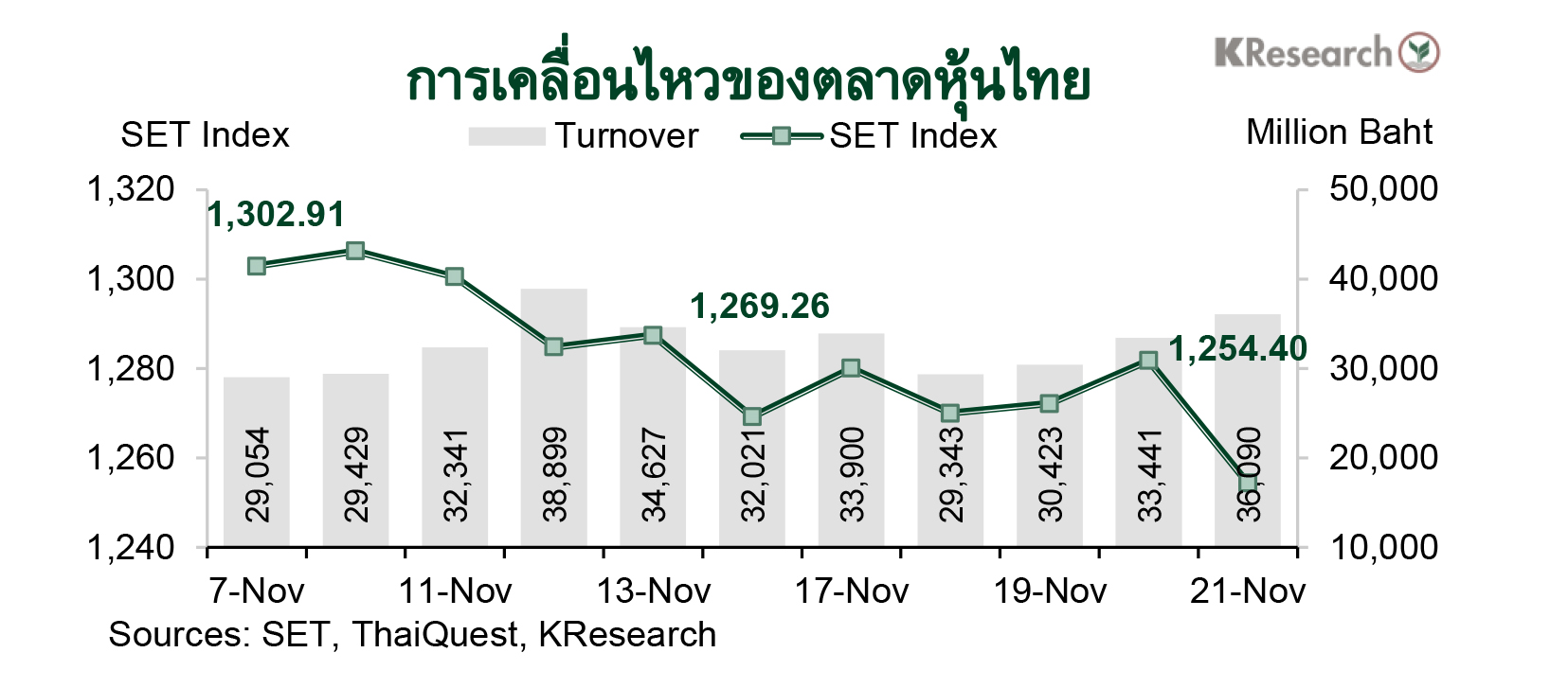 · สัปดาห์ถัดไป (24-28 พ.ย. 68) บริษัทหลักทรัพย์กสิกรไทย จำกัด มองว่า ดัชนีหุ้นไทยมีแนวรับที่ 1,230 และ 1,215 จุด ขณะที่แนวต้านอยู่ที่ 1,265 และ 1,285 จุด ตามลำดับ โดยศูนย์วิจัยกสิกรไทยประเมินปัจจัยสำคัญที่ต้องติดตาม ได้แก่ ตัวเลขส่งออกเดือนต.ค. ของไทย และทิศทางเงินทุนต่างชาติ ส่วนข้อมูลเศรษฐกิจสหรัฐฯ ที่สำคัญ ได้แก่ ดัชนีราคาผู้ผลิตเดือนก.ย. รายงาน Beige Book ของเฟด และจำนวนผู้ขอรับสวัสดิการว่างงานรายสัปดาห์ ขณะที่ปัจจัยเศรษฐกิจต่างประเทศอื่น ๆ ได้แก่ กำไรบริษัทภาคอุตสาหกรรมเดือนต.ค. ของจีน ตลอดจนผลผลิตภาคอุตสาหกรรมและยอดค้าปลีกเดือนต.ค. ของญี่ปุ่น