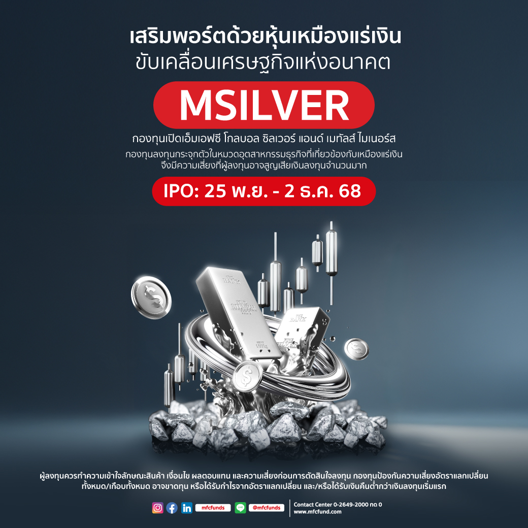 ทั้งนี้ผู้ที่สนใจลงทุน กำหนดเปิดขาย IPO ระหว่างวันที่ 25 พ.ย. - 2 ธ.ค. 2568 ลงทุนขั้นต่ำ 1,000 บาท กองทุนมีระดับความเสี่ยง 7 กองทุน MSILVER ลงทุนกระจุกตัวในหมวดอุตสาหกรรมธุรกิจที่เกี่ยวข้องกับเหมืองแร่เงิน จึงมีความเสี่ยงที่ผู้ลงทุนอาจสูญเสียเงินลงทุนจำนวนมาก ผู้ลงทุนควรทำความเข้าใจลักษณะสินค้า เงื่อนไข ผลตอบแทน และความเสี่ยงก่อนการตัดสินใจลงทุน กองทุนป้องกันความเสี่ยงอัตราแลกเปลี่ยนทั้งหมด/เกือบทั้งหมด อาจขาดทุนหรือได้รับกำไรจากอัตราแลกเปลี่ยน และ/หรือได้รับเงินคืนต่ำกว่าเงินลงทุนครั้งแรก สอบถามข้อมูลและขอรับหนังสือชี้ชวนได้ที่ บลจ.เอ็มเอฟซี จำกัด (มหาชน) และตัวแทนสนับสนุนการขาย หรือ โทรศัพท์ 0-2649-2000 ติดต่อฝ่ายวางแผนการลงทุน กด 2 หรือ Contact Center กด 0 สาขาแจ้งวัฒนะ โทร.0-2835-3055-57 สาขาปิ่นเกล้า โทร. 0-2014-3150-2 สาขาขอนแก่น โทร. 043-204-014-16 สาขาเชียงใหม่ โทร.0-5321-8480-82 สาขาระยอง โทร. 033-100-340 สาขาหาดใหญ่ โทร. 074-232-324-25 หรือที่ www.mfcfund.com