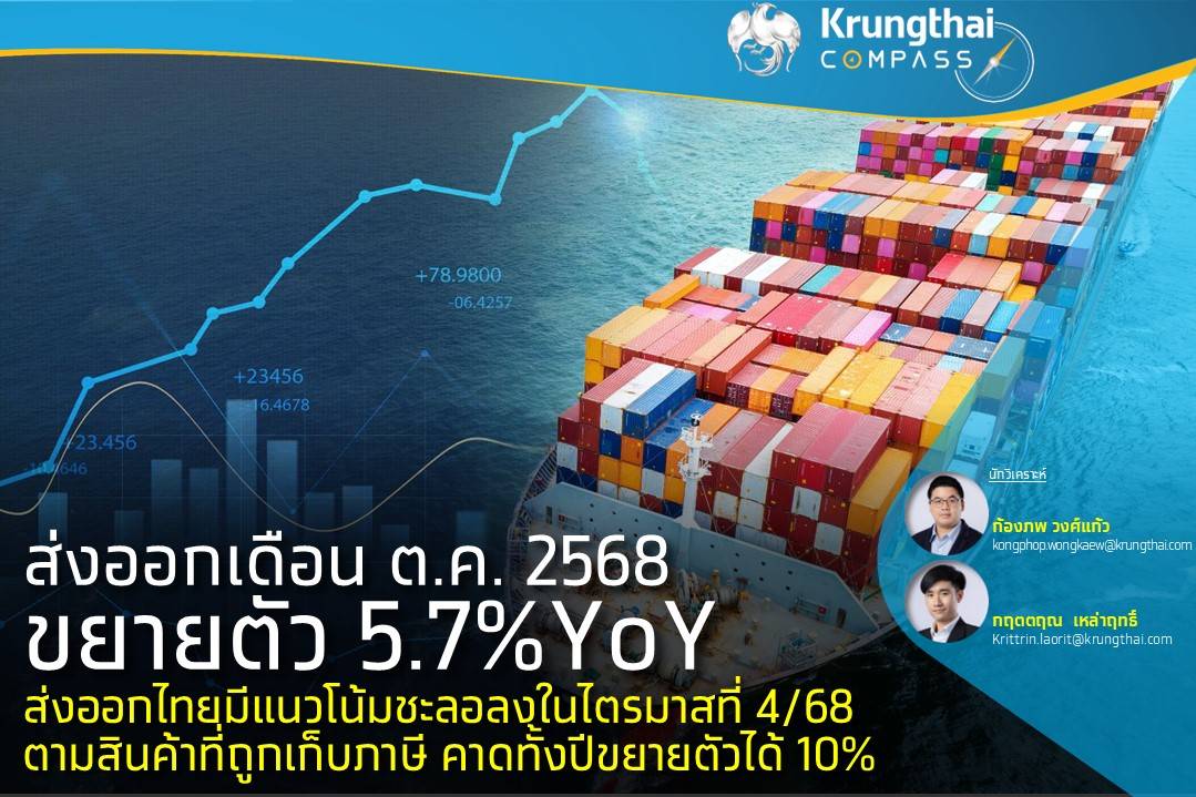 มูลค่าส่งออกเดือน ต.ค. 2568 ขยายตัว 5.7%YoY