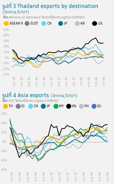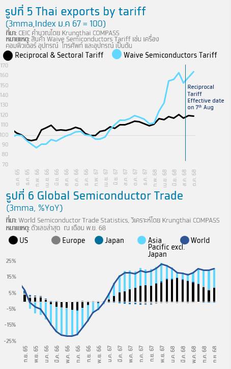 • Krungthai COMPASS ประเมินว่าการส่งออกไทยในปี 2568 จะขยายตัว 10% จากปีก่อน โดยยังต้องติดตามปัจจัยเสี่ยงที่จะกดดันการส่งออกไทยในไตรมาสที่ 4 ของปี 2568 ต่อเนื่องไปในปี 2569 นำโดยความเสี่ยงที่ไทยจะถูกเรียกเก็บภาษี Transshipment Tariff หรือเรียกเก็บ Sectoral Tariff เพิ่มเติม ท่ามกลางเศรษฐกิจโลกที่มีแนวโน้มชะลอตัวลงในระยะข้างหน้า 1 ประเทศหลักในภูมิภาคเอเชีย ได้แก่ จีน ไต้หวัน เกาหลีใต้ ญี่ปุ่น มาเลเซีย เวียดนามและไทย เป็นต้น