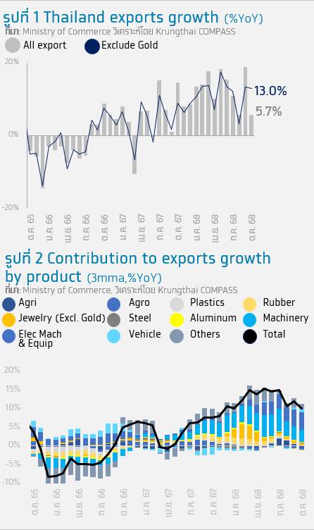 • Krungthai COMPASS คาดว่าการส่งออกไทยในไตรมาสสุดท้ายของปี 2568 จะชะลอลงตามการส่งออกสินค้าที่โดนเรียกเก็บภาษี หลังพบว่าสัญญาณการชะลอตัวชัดเจนขึ้น อย่างไรก็ดี การส่งออกสินค้าในกลุ่มอิเล็กทรอนิกส์จะช่วยประคับประคองการส่งออกในช่วงไตรมาสสุดท้ายของปี โดยคาดว่าการส่งออกในปี 2568 จะขยายตัว 10%