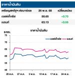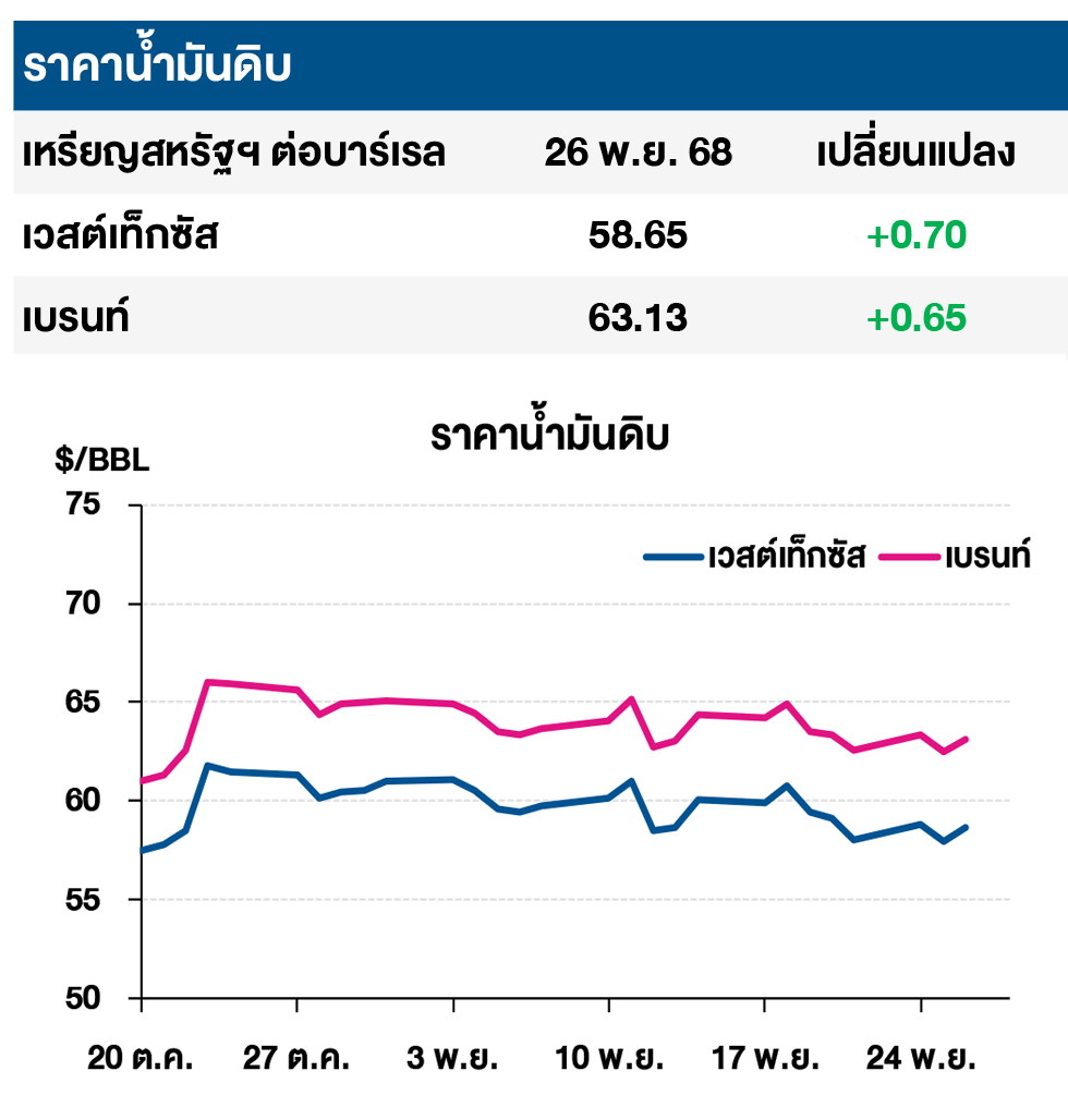 (+) ราคาน้ำมันดิบเวสต์เท็กซัส และ เบรนท์ปรับเพิ่มขึ้น จากการนำเข้าน้ำมันดิบของสหรัฐฯ ที่ปรับตัวสูงสุดในรอบ 11 สัปดาห์ที่ผ่านมา สะท้อนไปยังน้ำมันดิบคงคลังของสหรัฐฯ โดยสำนักงานสารสนเทศด้านพลังงาน (EIA) เผยตัวเลขน้ำมันดิบคงคลังสหรัฐฯ ที่ปรับเพิ่ม 2.8 ล้านบาร์เรล แตะระดับ 426.9 ล้านบาร์เรล ณ สัปดาห์สิ้นสุดวันที่ 21 พ.ย. 68