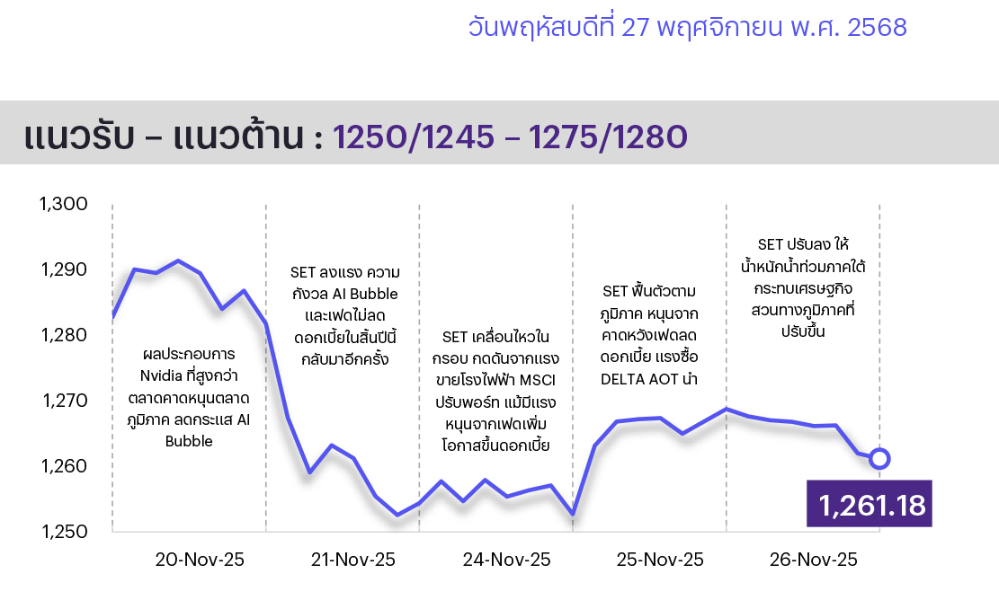 ช่วงสั้นมอง SET จะแกว่งตัวในกรอบ 1240-1300 จุด หลังตลาดยังขาดปัจจัยชี้นำใหม่ โดยปัจจัยในประเทศที่ต้องติดตาม ได้แก่ ความคืบหน้าการเจรจาภาษีไทย-สหรัฐฯ, ดุลการค้า ต.ค., ดัชนีผลผลิตอุตสาหกรรม ต.ค. และ ครม. เศรษฐกิจพิจารณามาตรการช่วยเหลือสภาพคล่องผู้ประกอบการ SMEs และมาตรการส่งเสริมการลงทุนเร่งด่วน (BOI Fast Pass) ขณะที่ปัจจัยต่างประเทศที่ต้องติดตาม ได้แก่ ตัวเลขเศรษฐกิจสหรัฐฯ ที่สำคัญ อาทิ ดัชนี PCE และ PPI ก.ย., GDP 3Q68 (รายงานครั้งที่ 2) ดังนั้นกลยุทธ์ลงทุนจึงแนะนำให้ “Selective Buy”