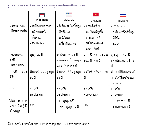 อย่างไรก็ดี นโยบายส่งเสริมการลงทุนของไทยยังมีศักยภาพดึงดูดการลงทุนจากต่างประเทศได้ดี แต่จำเป็นต้องทบทวนอย่างต่อเนื่องเพื่อพร้อมรับโอกาสและความท้าทายจากทิศทางการลงทุนของโลกที่เปลี่ยนแปลงอยู่เสมอ เมื่อเปรียบเทียบนโยบายส่งเสริมการลงทุนของไทยกับประเทศคู่แข่งสำคัญอย่างอินโดนีเซีย, มาเลเซีย และเวียดนาม (รูปที่ 6) ไทยยังมีความสามารถในการแข่งขันสูง โดยมีจุดแข็งสำคัญหลายประการ เช่น การให้สิทธิประโยชน์ทางภาษีสูงสุด 13 ปี พร้อมสิทธิลดหย่อนเพิ่มเติมอีก 5 ปี การอนุญาตให้ต่างชาติถือครองที่ดินภายใต้เงื่อนไข BOI และการนิคมอุตสาหกรรม (กนอ.) การออกวีซ่า LTR Visa และ Smart Visa ที่ช่วยดึงดูดบุคลากรทักษะสูงเข้าสู่ภาคอุตสาหกรรมเป้าหมาย รวมถึงโครงสร้างพื้นฐานอุตสาหกรรมและโลจิสติกส์ที่พร้อมรองรับการตั้งฐานการผลิตขั้นสูง อย่างไรก็ตาม ไทยยังต้องเผชิญกับการแข่งขันจากประเทศในอาเซียนที่มีจุดแข็งเฉพาะตัว ไม่ว่าจะเป็นเวียดนาม ที่มีความได้เปรียบด้านข้อตกลงการค้าเสรี (FTA) ครอบคลุมกว่า 60 ประเทศ มาเลเซียที่มีนโยบายส่งเสริมอุตสาหกรรมเทคโนโลยีขั้นสูงที่ชัดเจน เช่น การให้เงินสนับสนุนผู้ผลิตเซมิคอนดักเตอร์ผ่านแผนพัฒนาอุตสาหกรรมเซมิคอนดักเตอร์แห่งชาติ และอินโดนีเซีย ซึ่งมีทรัพยากรแร่ธาตุสำคัญต่อระบบนิเวศยานยนต์ไฟฟ้า
