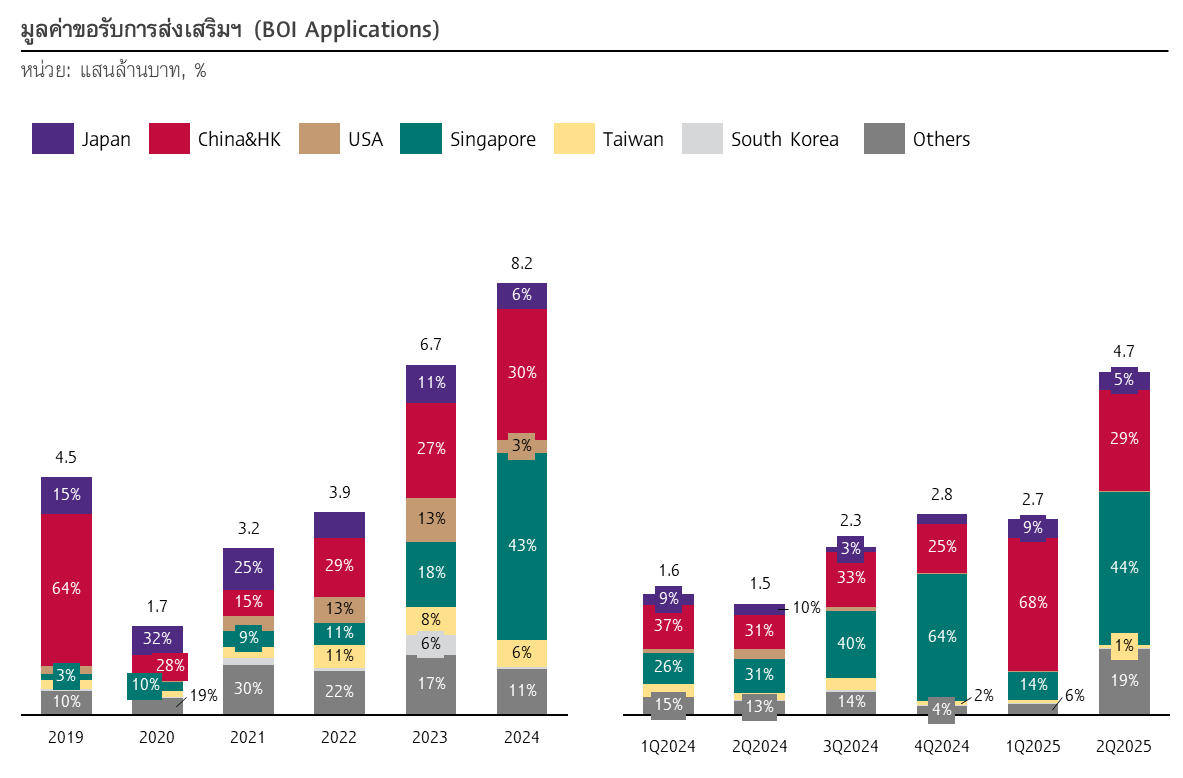 ในภาพรวม ไทยยังคงเป็นจุดหมายการลงทุนที่น่าดึงดูดในสายตานักลงทุนต่างชาติ แม้จะเผชิญความท้าทายจากความไม่แน่นอนของภาวะการค้าโลก สะท้อนจากมูลค่าการขอรับการส่งเสริมการลงทุนจากต่างประเทศในไตรมาสที่ 2 ปี 2025 (หลังสหรัฐฯ ประกาศนโยบายภาษี) ที่ยังเพิ่มขึ้นจากไตรมาสก่อนหน้าจาก 2.67 แสนล้านบาท มาอยู่ที่ 4.70 แสนล้านบาท และเริ่มชะลอตัวในไตรมาสที่ 3 (สหรัฐฯ เริ่มใช้นโยบายภาษี) มาอยู่ที่ 2.47 แสนล้านบาทจากการลดลงของมูลค่าการลงทุนในอุตสาหกรรมดิจิทัลหลังขยายตัวสูงในช่วงก่อนหน้า อย่างไรก็ดี