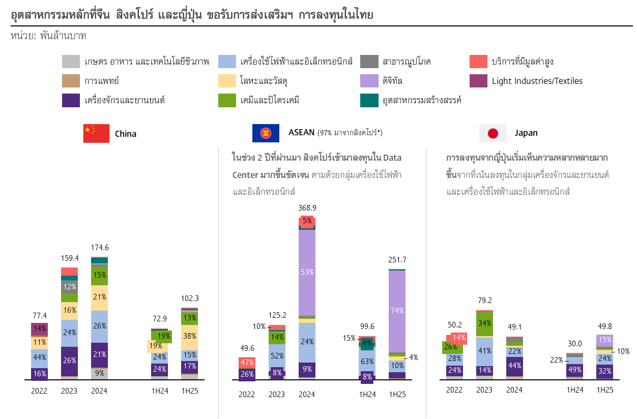 การลงทุนจากต่างประเทศขยายไปสู่กิจการย่อยที่มีมูลค่าเพิ่มสูงมากขึ้นทั้งการลงทุนในเทคโนโลยีขั้นสูงและดิจิทัล, การลงทุนใน EV Ecosystem รวมถึงการลงทุนในอุตสาหกรรมที่สอดคล้องกับเทรนด์อนาคต ซึ่งไม่เพียงช่วยเสริมความแข็งแกร่งให้กับอุตสาหกรรมหลักของไทย แต่ยังสามารถต่อยอดดึงดูดการลงทุนในกิจการสนับสนุนและห่วงโซ่ที่เกี่ยวเนื่องให้เติบโตตามไปด้วย