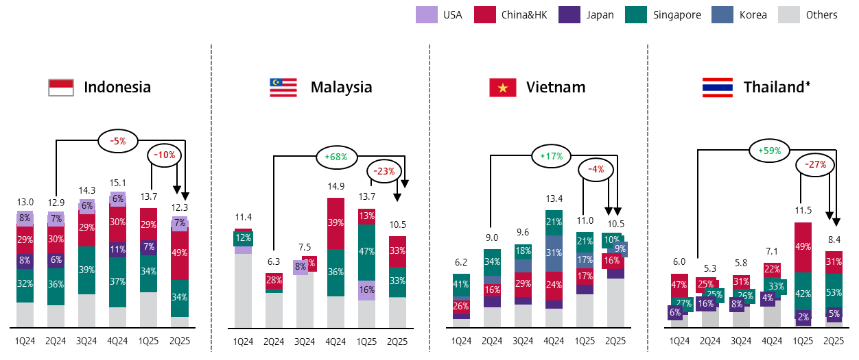 แม้การลงทุนจากต่างประเทศในไทยจะมีโอกาสขยายตัว แต่เมื่อเทียบกับประเทศเพื่อนบ้านในอาเซียนแล้ว ไทยยังตามหลังหลายประเทศ จากตัวเลขมูลค่าอนุมัติการลงทุนจากต่างประเทศของประเทศจุดหมายการลงทุนสำคัญในอาเซียนอย่างอินโดนีเซีย, มาเลเซีย, เวียดนาม และไทย พบว่ามูลค่าการอนุมัติการลงทุนในไตรมาสที่ 2 ของปี 2025 เริ่มชะลอตัวจากไตรมาสแรก แต่ในภาพรวมยังอยู่ในระดับสูงเมื่อเทียบกับปี 2024 สะท้อนได้ว่า ประเทศในอาเซียนยังเป็นจุดหมายการลงทุนที่ได้รับความสนใจจากนักลงทุนต่างชาติ แต่ในขณะเดียวกัน การแข่งขันในภูมิภาคก็มีแนวโน้มรุนแรงขึ้น โดยเฉพาะการดึงดูดการลงทุนจากฐานทุนสำคัญอย่างจีน และสิงคโปร์ ซึ่งจะกดดันการขยายตัวของมูลค่าการลงทุนจากต่างประเทศในไทยในระยะข้างหน้า โดยที่ผ่านมา มูลค่าการอนุมัติการลงทุนจากต่างประเทศของไทยยังตามหลังประเทศเพื่อนบ้านทั้งอินโดนีเซีย, มาเลเซีย และเวียดนาม อีกทั้ง เมื่อพิจารณาสัดส่วนการลงทุนจากต่างประเทศต่อผลิตภัณฑ์มวลรวมในประเทศ (FDI ต่อ GDP) ในปี 2024 แล้ว ไทยอยู่ในระดับ 2.7% ซึ่งต่ำกว่ามาเลเซียกับเวียดนามที่อยู่ในระดับ 4% และสิงคโปร์ที่อยู่ราว 28% สอดคล้องกับข้อมูลของกองทุนการเงินระหว่างประเทศ (IMF) ที่ระบุว่า สัดส่วนการลงทุนรวมทั้งจากในและต่างประเทศต่อ GDP ในปี 2024 ของไทยอยู่ในระดับต่ำสุดในภูมิภาคที่ระดับ 22% เมื่อเทียบกับอินโดนีเซีย และเวียดนามที่มีสัดส่วนสูงถึง 31% อีกทั้ง IMF ยังประเมินว่าการลงทุนรวมของไทยอาจลดลงไปอยู่ที่ 21% ภายในปี 2030 สะท้อนว่าไทยยังมีข้อจำกัดในการสร้างแรงขับเคลื่อนการลงทุนทั้งจากในและต่างประเทศอย่างจริงจังและต่อเนื่อง