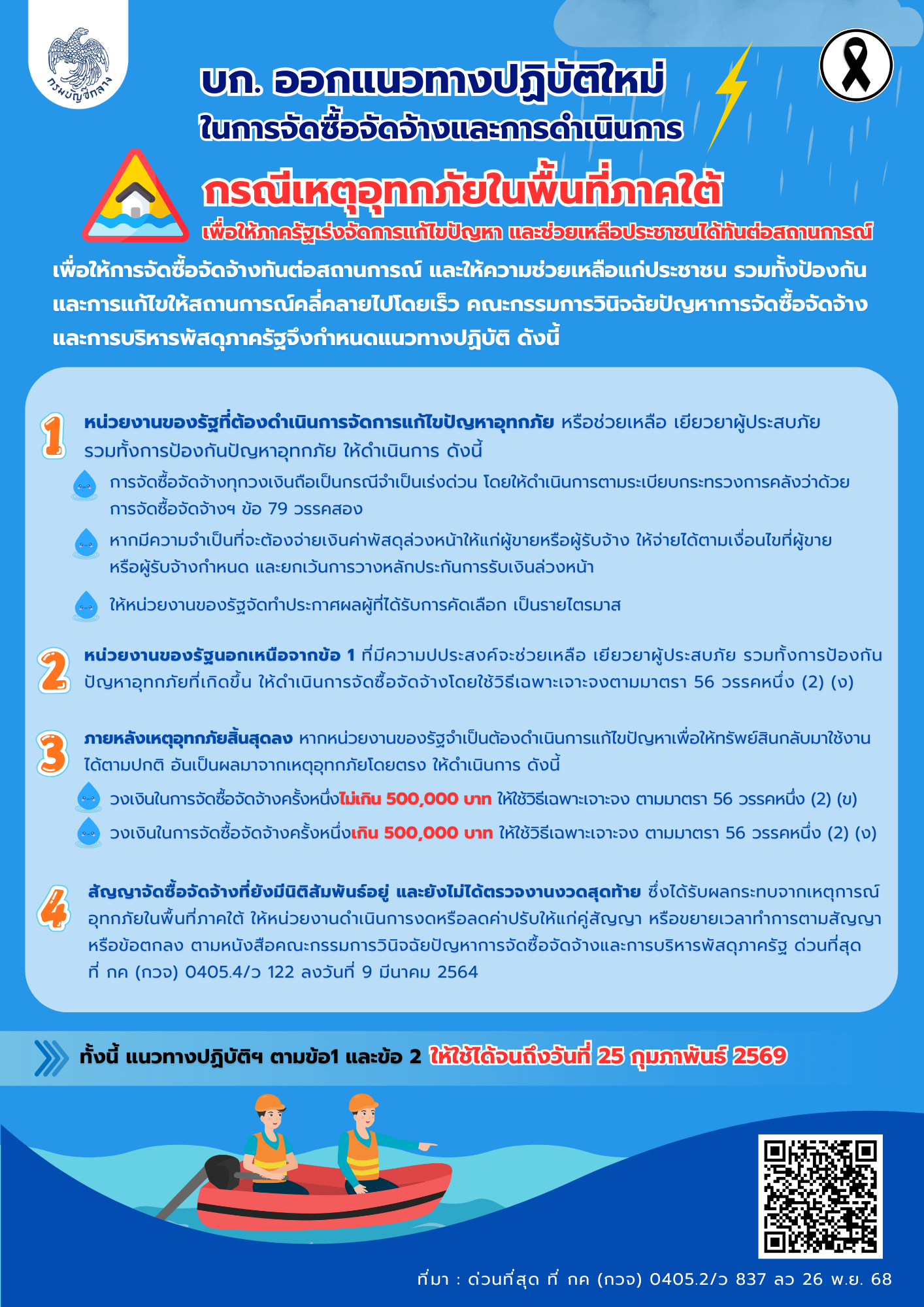 นางแพตริเซีย มงคลวนิช อธิบดีกรมบัญชีกลาง เปิดเผยว่า จากสถานการณ์มหาอุทกภัยในพื้นที่ภาคใต้ซึ่งก่อให้เกิดอันตรายต่อชีวิตของประชาชน และสร้างความเสียหายแก่ทรัพย์สินของประชาชนและราชการเป็นวงกว้าง จึงมีความจำเป็นเร่งด่วนในการจัดซื้อจัดจ้างเพื่อให้ทันต่อสถานการณ์และให้ความช่วยเหลือแก่ประชาชน รวมทั้งป้องกันและแก้ไขให้สถานการณ์คลี่คลายไปโดยเร็ว ซึ่งหากดำเนินการจัดซื้อจัดจ้างตามปกติ จะทำให้ล่าช้าและเกิดความเสียหายตามมา ดังนั้น คณะกรรมการวินิจฉัยปัญหาการจัดซื้อจัดจ้างและการบริหารพัสดุภาครัฐ จึงกำหนดแนวทางปฏิบัติ ดังนี้