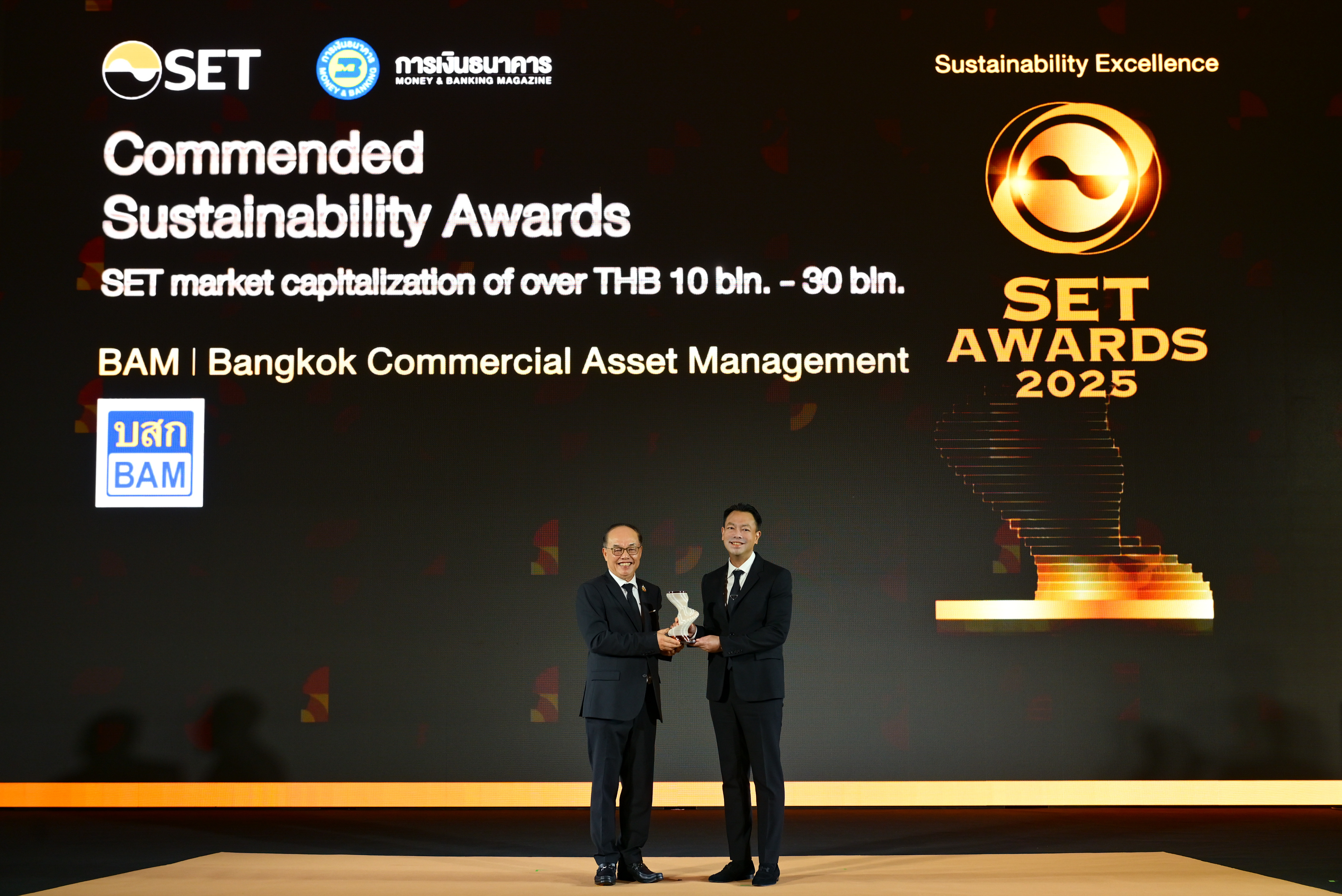 ดร.รักษ์ วรกิจโภคาทร ประธานเจ้าหน้าที่บริหาร บริษัทบริหารสินทรัพย์ กรุงเทพพาณิชย์ จำกัด (มหาชน) หรือ BAM เข้ารับรางวัลเกียรติยศแห่งความสำเร็จด้านความยั่งยืน “Commended Sustainability Awards” กลุ่มรางวัล Sustainability Excellence จากศาสตราจารย์พิเศษกิติติพงศ์ อุรพีพัฒนพงศ์ ประธานกรรมการ ตลาดหลักทรัพย์แห่งประเทศไทย ในงาน SET Awards 2025 ซึ่งจัดโดยตลาดหลักทรัพย์แห่งประเทศไทยร่วมกับวารสารการเงินธนาคาร โดยรางวัลดังกล่าวสะท้อนเจตนารมณ์ของ BAM ที่ให้ความสำคัญกับการบริหารธุรกิจแบบยั่งยืนในทุกมิติ พร้อมสร้างความเชื่อมั่นในทุกภาคส่วน ภายใต้วิสัยทัศน์ “เป็นองค์กรหลักในการพลิกทรัพย์ร้างให้เป็นทรัพย์สร้างคุณค่า” เพื่อช่วยขับเคลื่อนเศรษฐกิจและสังคมไทยให้เติบโตอย่างยั่งยืน”
