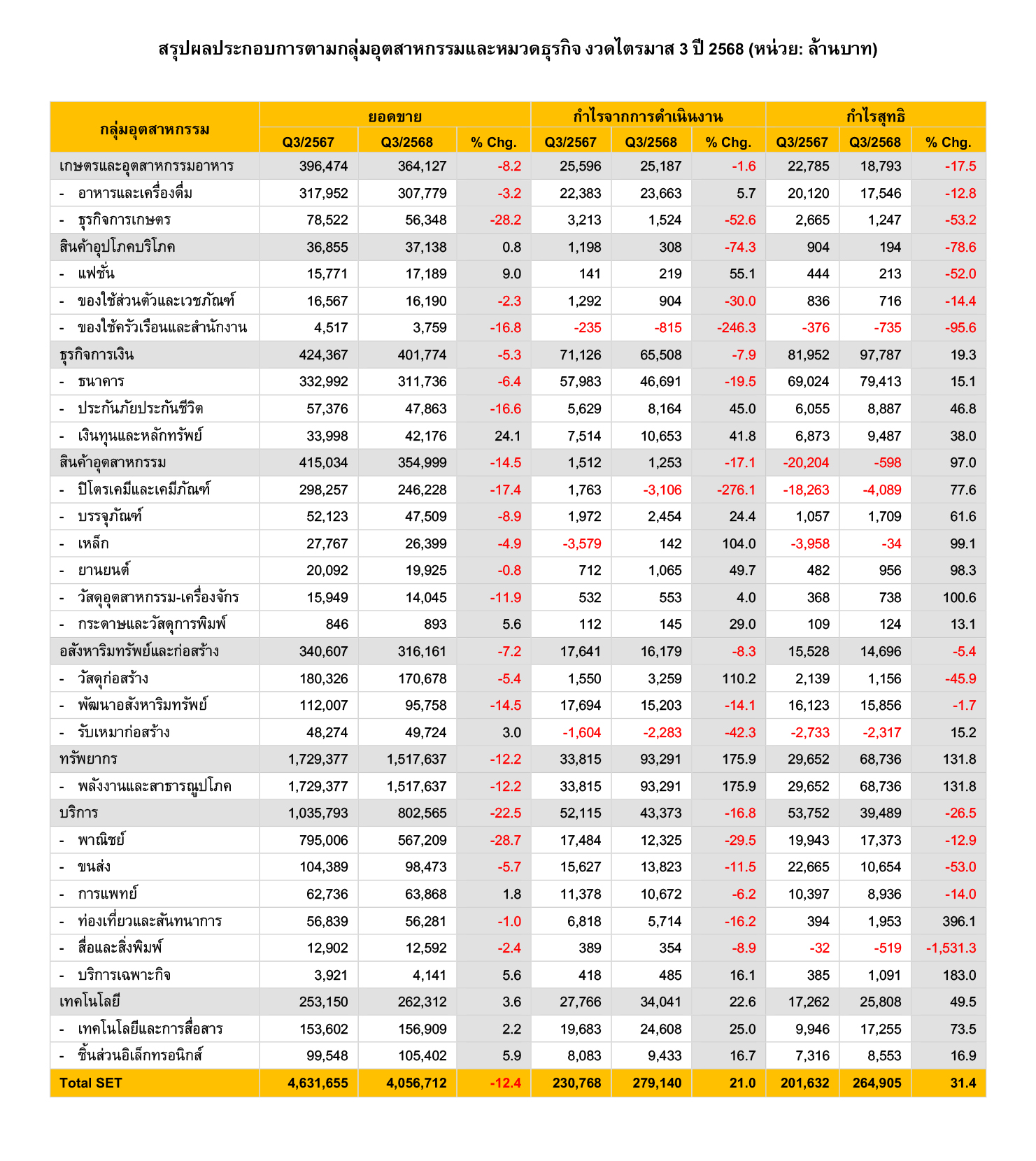 • ในไตรมาส 3/2568 บจ. เกือบทุกหมวดธุรกิจมียอดขาย และกำไรจากการดำเนินงานลดลง