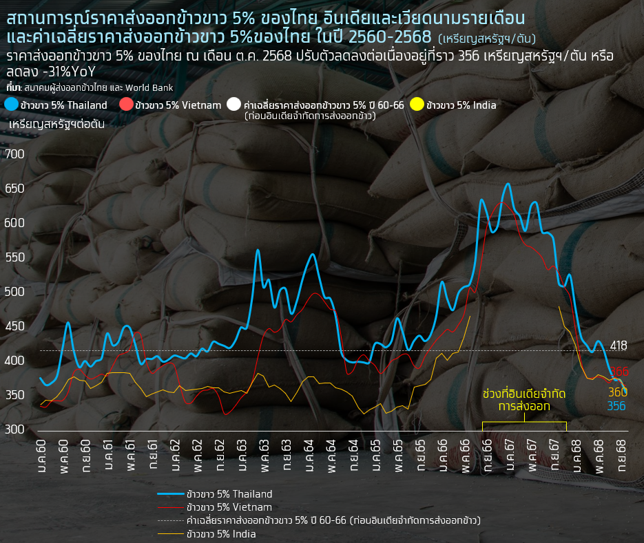 โดยราคาส่งออกข้าวขาว 5% เฉลี่ยของไทย ณ เดือน ต.ค. 2568 อยู่ที่ราว 356 เหรียญสหรัฐฯ/ตัน หรือลดลง -31%YoY และเป็นระดับราคาส่งออกที่ต่ำกว่าค่าเฉลี่ยราคาส่งออกข้าวขาว 5% ในปี 2560-2566 ซึ่งเป็นช่วงก่อนที่อินเดียจะจำกัดการส่งออกข้าวซึ่งอยู่ที่ราว 418 เหรียญสหรัฐฯ/ตัน ส่วนราคาส่งออกข้าวขาว 5% ของประเทศคู่แข่งอย่างอินเดีย และเวียดนาม ก็ปรับลดลงแรงเช่นกัน โดยมีราคาอยู่ที่ราว 360-366 เหรียญสหรัฐฯ/ตัน