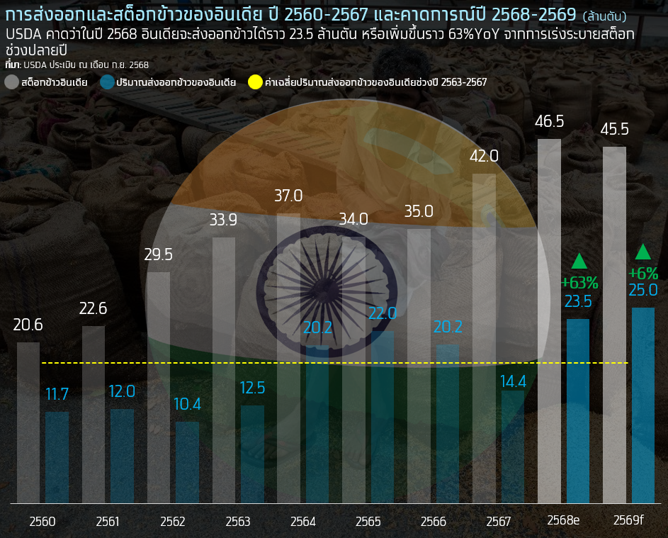 อินเดียประกาศระบายสต็อกข้าวครั้งใหญ่ ทำให้เกิดปัญหาอุปทานข้าวโลกล้นตลาด โดยเมื่อวันที่ 31 ก.ค. 2568 อินเดียประกาศระบายสต็อกครั้งใหญ่ ภายใต้โครงการ Open Market Sale Scheme (OMSS-D) ซึ่งจะมีผลในการทยอยปล่อยข้าวออกสู่ตลาดตั้งแต่ช่วง ก.ย. 2568 เป็นต้นไป โดยมีเป้าหมายรวมกว่า 20 ล้านตัน ซึ่งจะกดดันราคาข้าวในตลาดโลกให้ต่ำลง เนื่องจากอินเดียครองสัดส่วนการส่งออกข้าวมากกว่าหนึ่งในสามของโลก ทำให้เกิดภาวะข้าวล้นตลาด (oversupply) ซึ่งจะทำให้ราคาข้าว เช่น ข้าวขาว 5% ถูกกดดันให้ลดลงอย่างรวดเร็ว ส่งผลกระทบโดยตรงต่อผู้ส่งออกคู่แข่งอย่างไทย เวียดนาม และปากีสถาน ที่ต้องปรับลดราคาเพื่อรักษาส่วนแบ่งตลาด ซึ่งสอดคล้องกับการประเมินของ USDA ที่คาดว่าในปี 2568 อินเดียจะส่งออกข้าวได้ราว 23.5 ล้านตัน หรือเพิ่มขึ้นจากปี 2567 ราว 63% และสูงกว่าค่าเฉลี่ยช่วงปี 2563-2567 ที่อยู่ที่ราว 17.9 ล้านตัน
