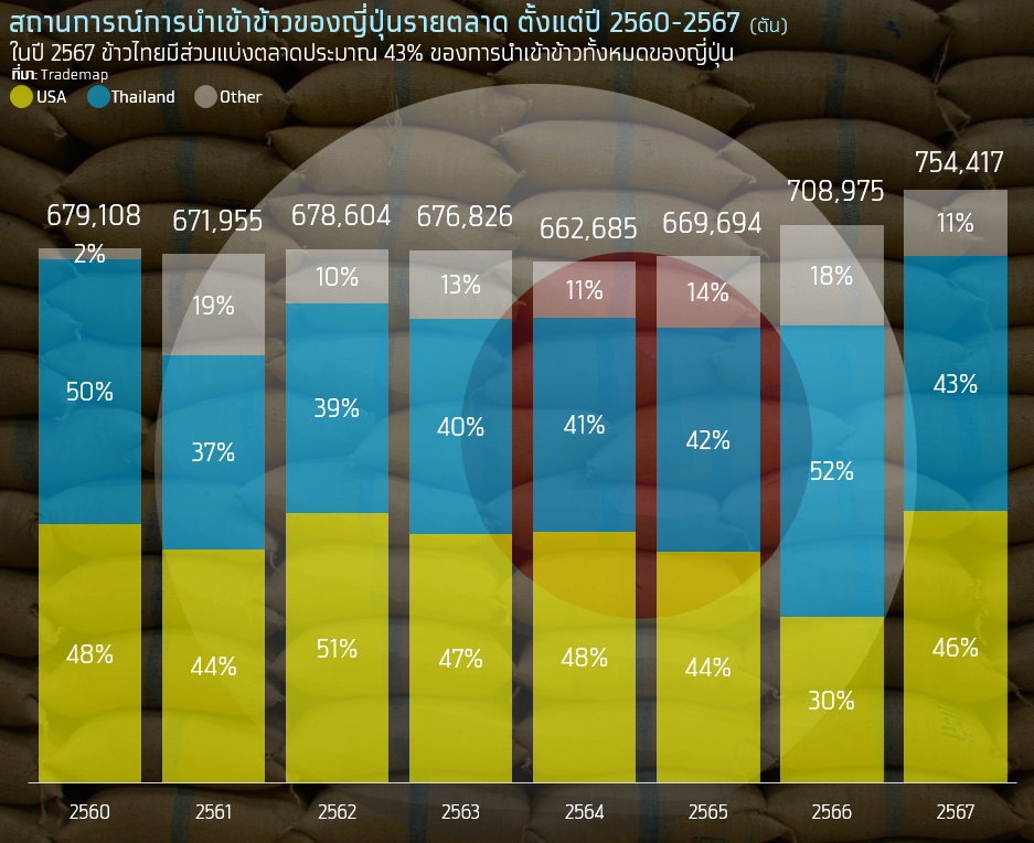 สหรัฐฯ ได้เจรจากับคู่ค้า เช่น ญี่ปุ่นให้เพิ่มการนำเข้าข้าวจากสหรัฐฯ มากขึ้น ซึ่งอาจส่งผลให้ไทยสูญเสียส่วนแบ่งตลาดและรายได้จากการส่งออกข้าวไปยังญี่ปุ่น โดยในปี 2567 ข้าวไทยมีส่วนแบ่งตลาดประมาณ 43% ของการนำเข้าข้าวทั้งหมดของญี่ปุ่น โดยในช่วงเดือน ก.ค. 2568 สหรัฐฯ และญี่ปุ่นได้บรรลุข้อตกลงที่ญี่ปุ่นจะเพิ่มการนำเข้าข้าวจากสหรัฐฯ ถึง 75% ภายใต้ระบบโควตา “Minimum Access" ขององค์การการค้าโลก (WTO) ซึ่งอนุญาตให้นำเข้าข้าวได้โดยไม่เสียภาษีศุลกากรประมาณ 770,000 ตัน/ปี ซึ่งการเพิ่มขึ้นของการนำเข้าข้าวจากสหรัฐฯ อาจส่งผลกระทบต่อส่วนแบ่งตลาดของข้าวไทยในญี่ปุ่น ดังนั้น การที่สหรัฐฯ เจรจาญี่ปุ่นให้เพิ่มการนำเข้าข้าวจากสหรัฐฯ อาจทำให้ข้าวไทยเผชิญกับการแข่งขันที่รุนแรงขึ้นในตลาดญี่ปุ่น