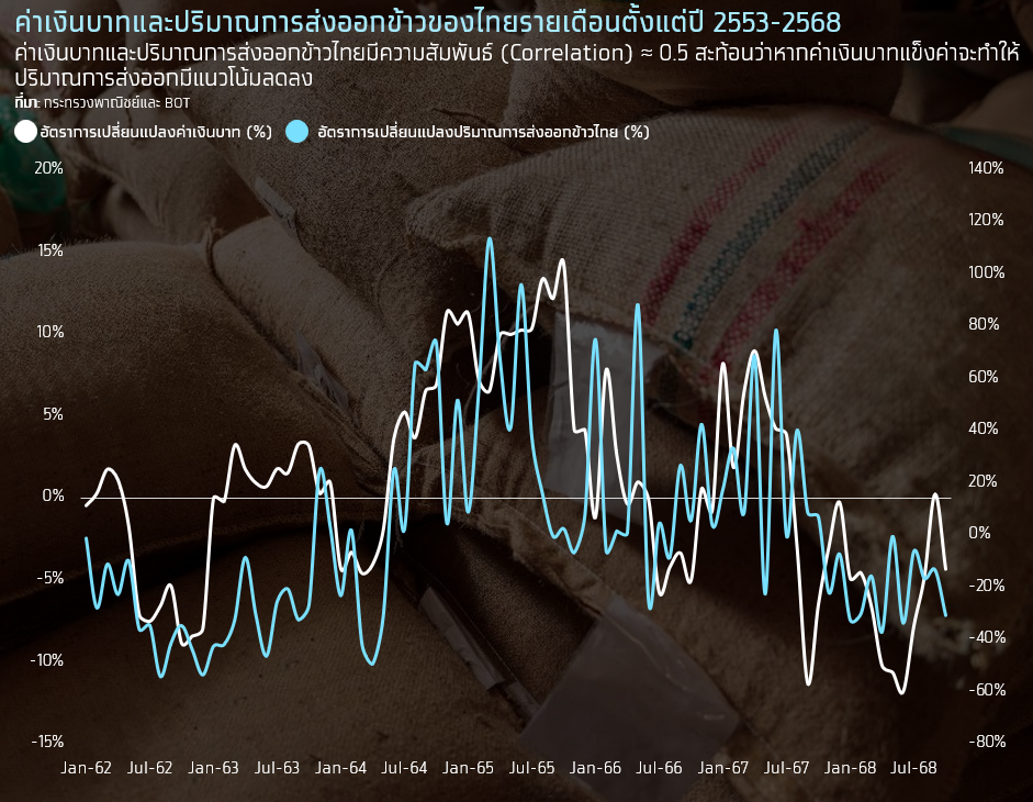 ค่าเงินบาทเป็นปัจจัยสำคัญที่ส่งผลโดยตรงต่อความสามารถในการแข่งขันของการส่งออกข้าวไทย สอดคล้องกับมุมมองของสมาคมผู้ส่งออกข้าวไทยที่มองว่า หากเงินบาทแข็งค่า อาจทำให้ตั้งราคาส่งออกลำบากและแพงกว่าคู่แข่ง โดยหากค่าเงินแข็งทุก 1 บาท จะทำให้ราคาส่งออกข้าวเพิ่มขึ้น 15 เหรียญสหรัฐฯ/ตัน1 ส่งผลให้ราคาข้าวไทยในเชิงเปรียบเทียบสูงกว่าคู่แข่ง เช่น เวียดนามหรืออินเดีย ทำให้ผู้นำเข้าบางประเทศหันไปซื้อจากแหล่งอื่นแทน ในทางกลับกัน หากเงินบาทอ่อนค่า ราคาข้าวไทยจะถูกลงในสายตาผู้ซื้อ ทำให้การส่งออกเพิ่มขึ้นและรายได้สุทธิของผู้ส่งออกสูงขึ้น โดยผลการวิเคราะห์ข้อมูลในช่วงหลายปีที่ผ่านมาแสดงว่า ความสัมพันธ์ระหว่างอัตราการเปลี่ยนแปลงของค่าเงินบาทและปริมาณการส่งออกข้าวไทยมีค่า Correlation ราว 0.5 ซึ่งเป็นความสัมพันธ์เชิงบวกและสะท้อนว่าค่าเงินบาทมีผลต่อการส่งออกข้าวของไทย ทำให้ในระยะข้างหน้าหากค่าเงินบาทยังคงมีแนวโน้มแข็งค่าต่อเนื่อง อาจทำให้ปริมาณส่งออกข้าวไทยมีแนวโน้มลดลง