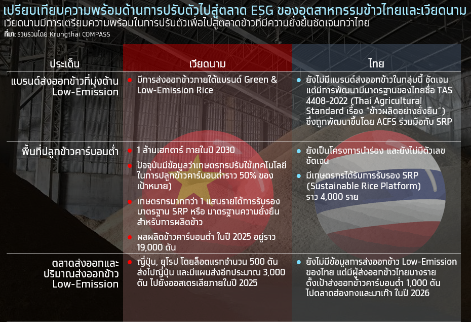 ความท้าทายที่ 5 ข้าวไทยกำลังเสียเปรียบเวียดนามในการปรับตัวไปสู่ตลาด Low Emission Rice ซึ่งกระทบโอกาสในการขยายตลาดข้าวพรีเมียม