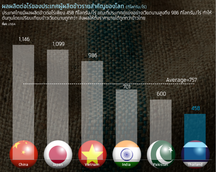 ความท้าทายที่ 6 ปัญหาเชิงโครงสร้างอย่างผลผลิตต่อไร่ของข้าวไทย ที่ยังต่ำกว่าประเทศคู่แข่ง กดดันต้นทุนยังคงสูงกว่าโดยเปรียบเทียบ