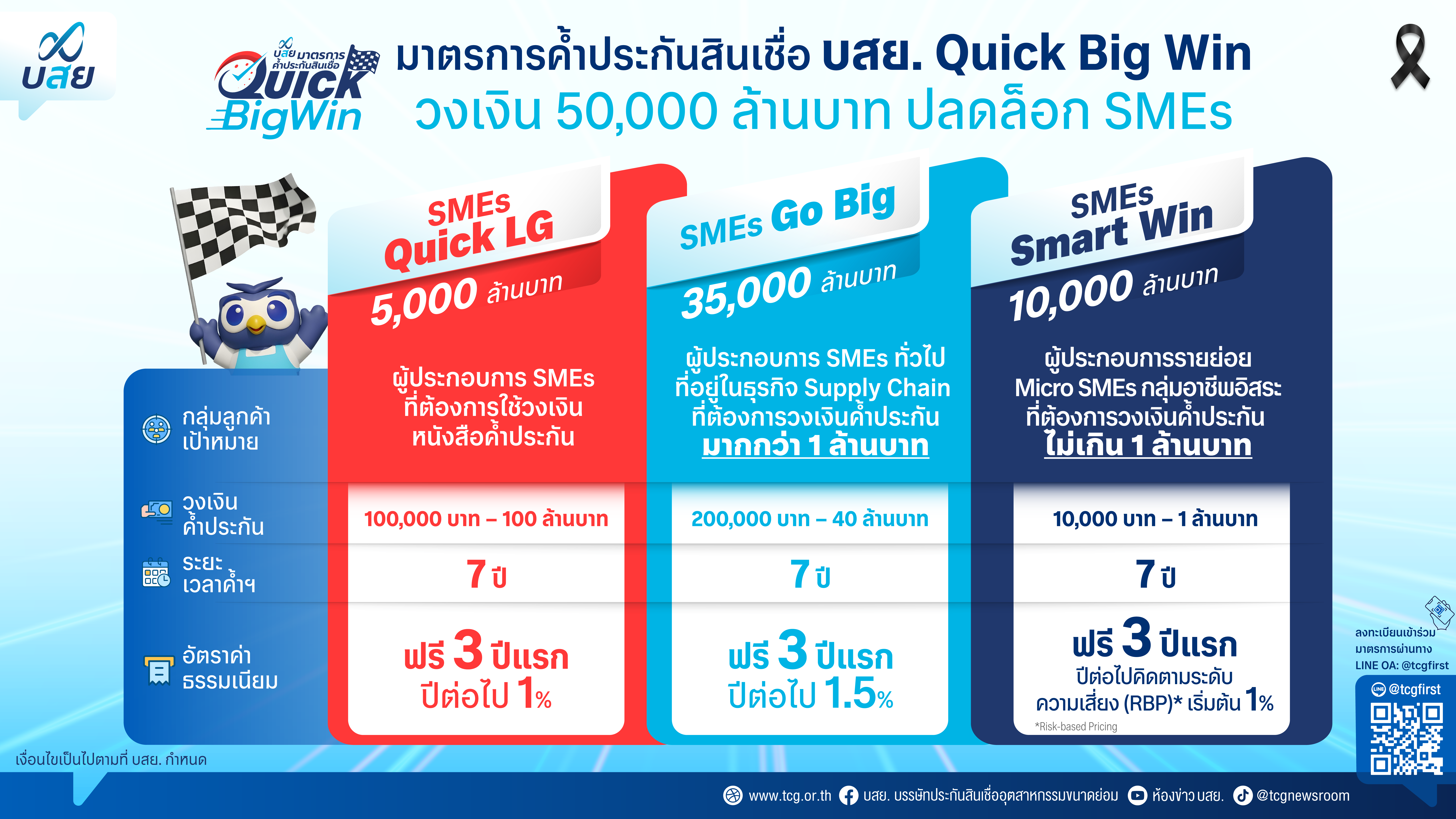 ในภาวะเศรษฐกิจที่ผันผวน บสย. ยังมีมาตรการ “บสย. พร้อมช่วย” หรือ มาตรการ 3 สี ม่วง เหลือง เขียว ที่ออกแบบมาเพื่อรองรับความสามารถในการชำระหนี้ จุดเด่นคือ การตัดต้นก่อนตัดดอก อัตราดอกเบี้ย 0% ผ่อนยาว 7 ปี โดยปลดหนี้ ลดเงินต้นให้สูงสุด 30% พร้อม “ยกดอกเบี้ย” ช่วยให้ลูกหนี้สามารถ “อยู่รอด อยู่ได้” และ “ปลดหนี้” ได้ง่ายขึ้น เร็วขึ้น ช่วยต่อลมหายใจให้ธุรกิจ และทำให้ลูกหนี้มีกำลังใจ กลับมาแข็งแรงได้อีกครั้ง นอกจากนี้ บสย. ยังทำหน้าที่เป็น “ที่ปรึกษาทางการเงิน” ให้คำปรึกษาด้านการเงินให้ SMEs เตรียมความพร้อมในการขอสินเชื่อ สร้างโอกาสการเติบโตทางธุรกิจเติบโตอย่างยั่งยืน โดย SMEs ที่สนใจเข้าร่วมโครงการค้ำประกันสินเชื่อ “บสย. Quick Big Win” สามารถเข้ามาตรวจสุขภาพทางการเงิน พร้อมจองคิวขอรับคำปรึกษาที่ LINE OA : @tcgfirst ฟรี! ไม่มีค่าใช้จ่าย หรือติดต่อขอทราบรายละเอียดเพิ่มเติมได้ที่ ศูนย์ที่ปรึกษาทางการเงิน SMEs (บสย. F.A. Center) หรือสำนักงานเขต บสย. 11 แห่งทั่วประเทศ และ บสย. Call Center โทร. 02-890-9999