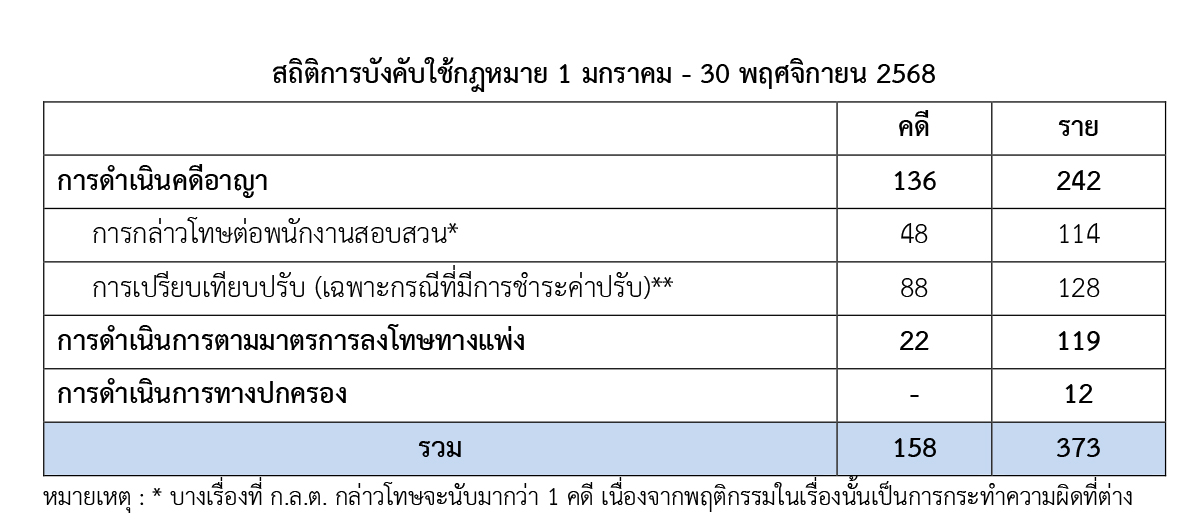 ทั้งนี้ ตั้งแต่ปี 2566 – 2568 การดำเนินการบังคับใช้กฎหมายผ่านทั้ง 3 ช่องทางหลักของ ก.ล.ต. มีจำนวนคดีที่แล้วเสร็จเพิ่มขึ้นต่อเนื่อง โดยในปี 2566 มีจำนวน 82 คดี ผู้กระทำผิด 280 ราย ปี 2567 มีจำนวน 128 คดี ผู้กระทำผิด 346 ราย และในปี 2568 (ข้อมูล ณ วันที่ 30 พฤศจิกายน 2568) มีจำนวน 158 คดี ผู้กระทำผิดรวม 373 ราย