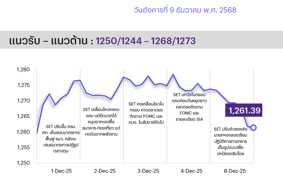 คาดตลาดแกว่งไซด์เวย์/แกว่งลง มาตรการส่งเสริมการออม (ISA)อาจเสนอครม.วันนี้ เบื้องต้นอาจจะยังไม่ได้ส่งผลทันทีในแง่เม็ดเงินที่จะไหลเข้าตลาดเนื่องจากมีผล 1 ม.ค. 69 และแรงซื้อมักเข้ามาช่วงปลายปี ขณะที่ชายแดนไทย-กัมพูชามีโอกาสรุนแรงมากกว่าครั้งก่อนๆ ปัจจัยต่างประเทศ รอผลการประชุมเฟดจะรู้ผลเช้าพฤหัสบดี ทางเทคนิค ตลาดยืนเหนือ 1278 ไม่ได้กลับมาลง แนวรับถัดไป 1250 ไม่ควรลงหลุดอีก ลงต่ำกว่าเปิดความเสี่ยงขาลงใหม่ แนวรับ 1250/1244 แนวต้าน 1268/1273