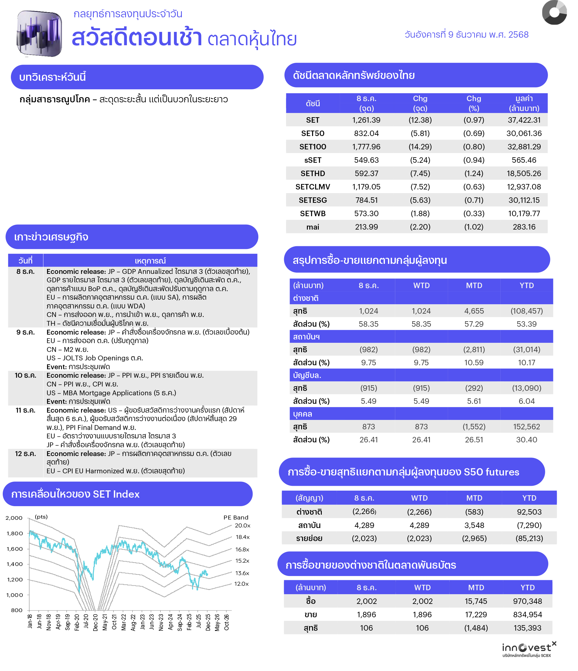 4. Trading Idea: นักลงทุนที่รับความเสี่ยงได้และต้องการเก็งกำไร แนะนำ 1) หุ้นที่คาดได้อานิสงส์บวกจากมีนโยบายภาครัฐหนุน อาทิ นโยบาย BOI Fast Pass แนะนำกลุ่มนิคม (WHA AMATA), นโยบายรนำร่องปลดล็อกช่วงเวลาห้ามขายเหล้าเบียร์ 14.00-17.00 น. เป็นเวลา 6 เดือน แนะนำกลุ่มค้าปลีก (CPALL BJC), นโยบายเพิ่มเงินสมทบประกันสังคม กลุ่มการแพทย์ (BCH CHG) 2) หุ้นเรือเทกองที่คาดได้อานิสงส์จากจีนต้องการเรือ Capesize เพิ่มขึ้นเพื่อขนส่งแร่เหล็กคุณภาพดีจากเหมืองแร่เหล็กใหม่ Simandou ของกินี ทำให้เรือ Supramax ไม่โดนแย่งงานและค่าระวางมีแนวโน้มดีขึ้น แนะนำ PSL TTA และ 3) หุ้นที่คาดนำเข้าคำนวณ SET50 ในรอบ 1H69 ซึ่งจะประกาศกลาง ธ.ค. นี้ แนะนำ SAWAD ITC