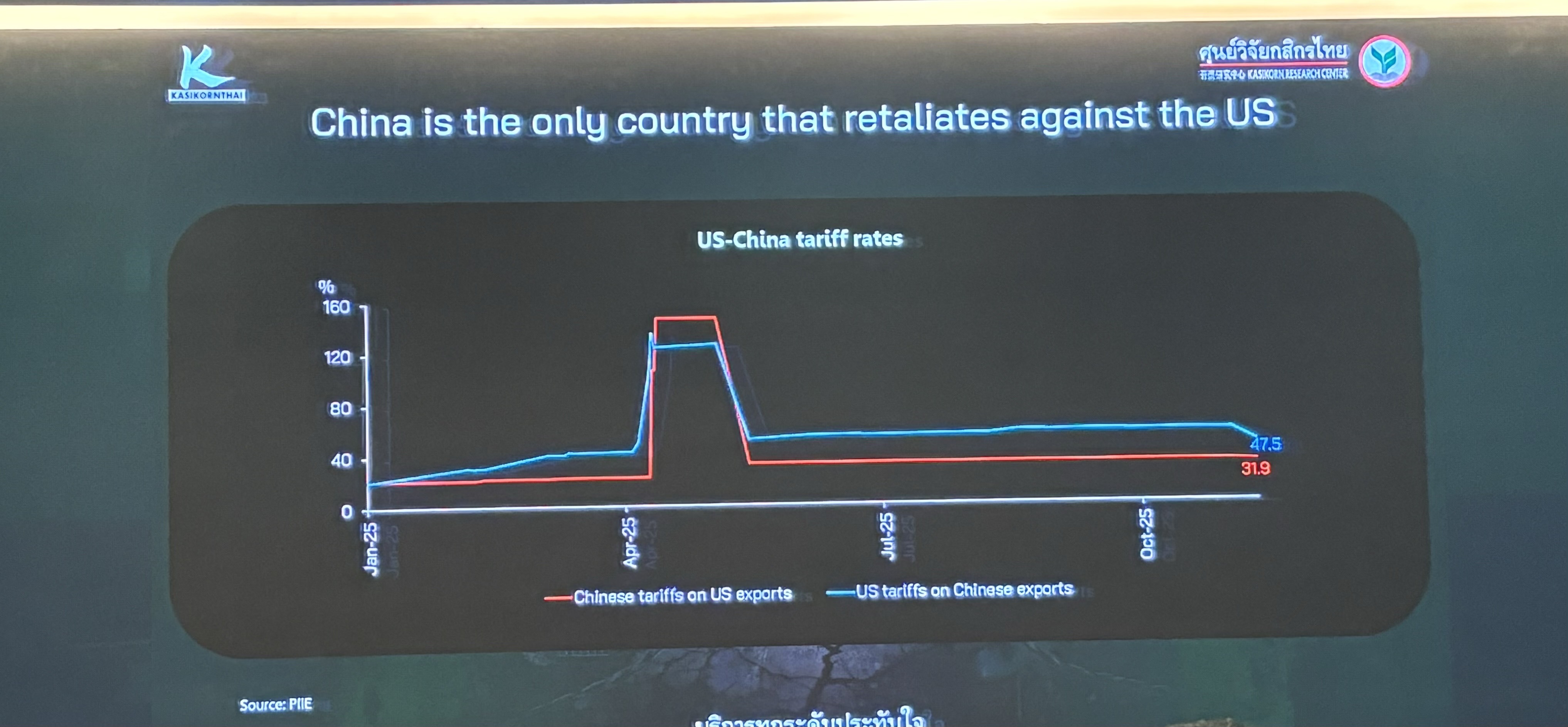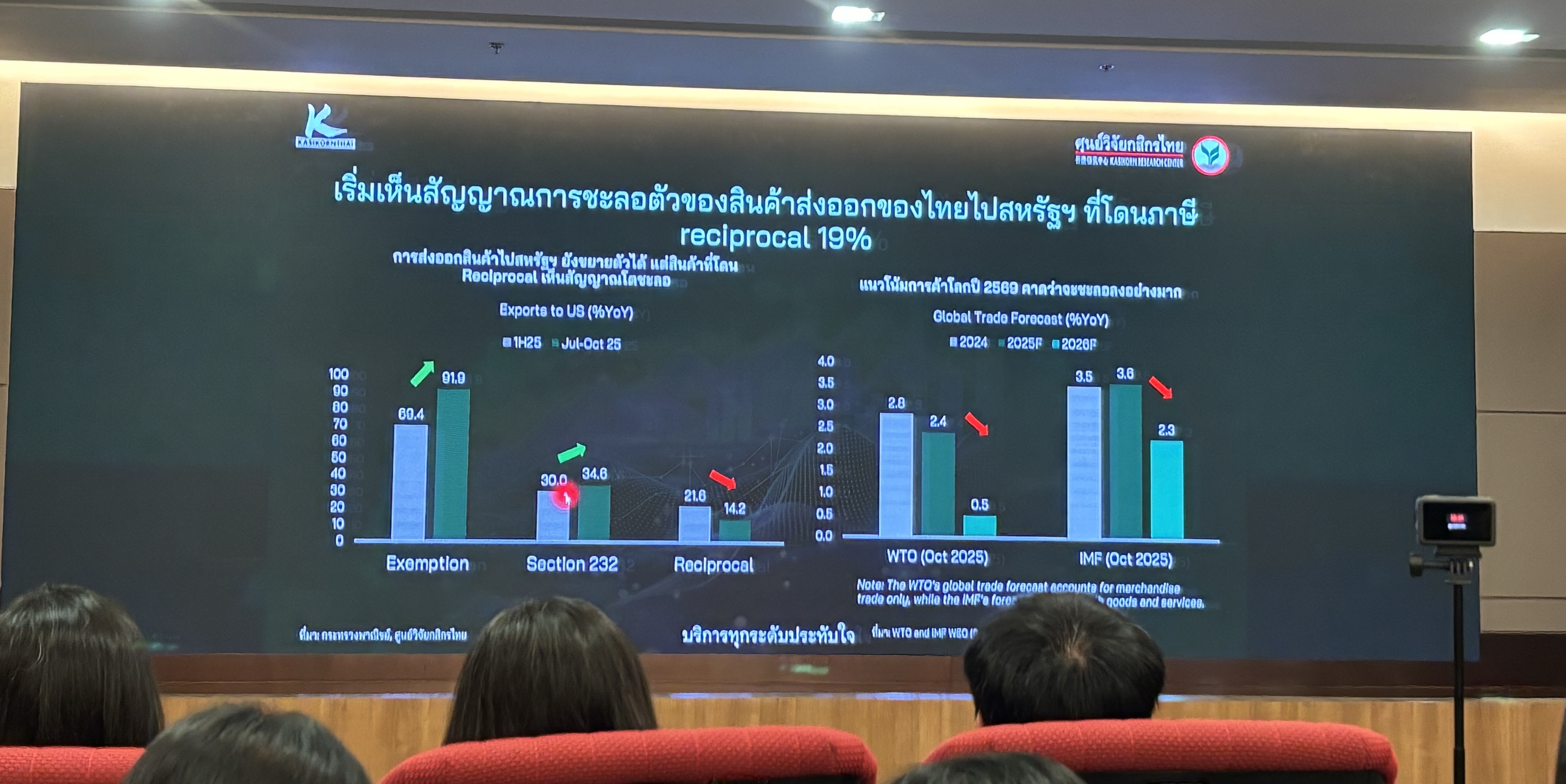 นายบุรินทร์ อดุลวัฒนะ กรรมการผู้จัดการ และ Chief Economist บริษัท ศูนย์วิจัยกสิกรไทย จำกัด เปิดเผยว่า ในปี 2569 องค์การการค้าโลก (WTO) คาดการณ์ว่าการค้าโลกมีแนวโน้มชะลอตัวลงจากปี 2568 ที่ขยายตัวได้ 2.4% มาอยู่ที่ 0.5% เนื่องจากมาตรการภาษีของทรัมป์ได้ส่งผลต่อต้นทุนการค้าและเพิ่มความไม่แน่นอน ในปี 2568 การค้าโลกได้อานิสงส์จากการเร่งส่งออกของภาคธุรกิจก่อนที่ภาษีเริ่มบังคับใช้จริงในเดือนสิงหาคม บวกกับแรงหนุนจากการส่งออกสินค้าเกี่ยวกับเทคโนโลยี AI ที่พุ่งแรง โดยเฉพาะการส่งออกจากเอเชียไปสหรัฐฯ ตามการลงทุนใน Data Center และโครงสร้างพื้นฐาน AI ของสหรัฐฯ สวนทางกับสินค้าประเภทอื่นที่ไม่ใช่ AI (Non-AI) ที่ชะลอตัวลงอย่างชัดเจน ในขณะที่การส่งออกจากจีนไปเอเชียยังเติบโตได้ดีต่างกับการส่งออกไปสหรัฐฯ อย่างไรก็ดีธุรกิจในประเทศจีนยังเผชิญกับการแข่งขันรุนแรงทั้งด้านกำลังการผลิตและสงครามราคา (Anti-Involution) ซึ่งกดดันการทำกำไรของภาคธุรกิจในจีนอย่างต่อเนื่อง