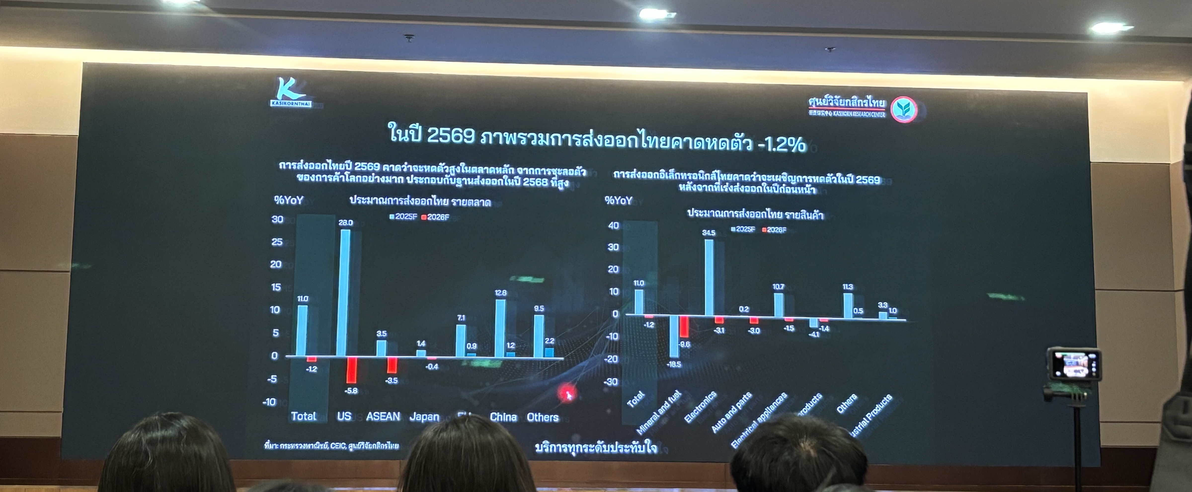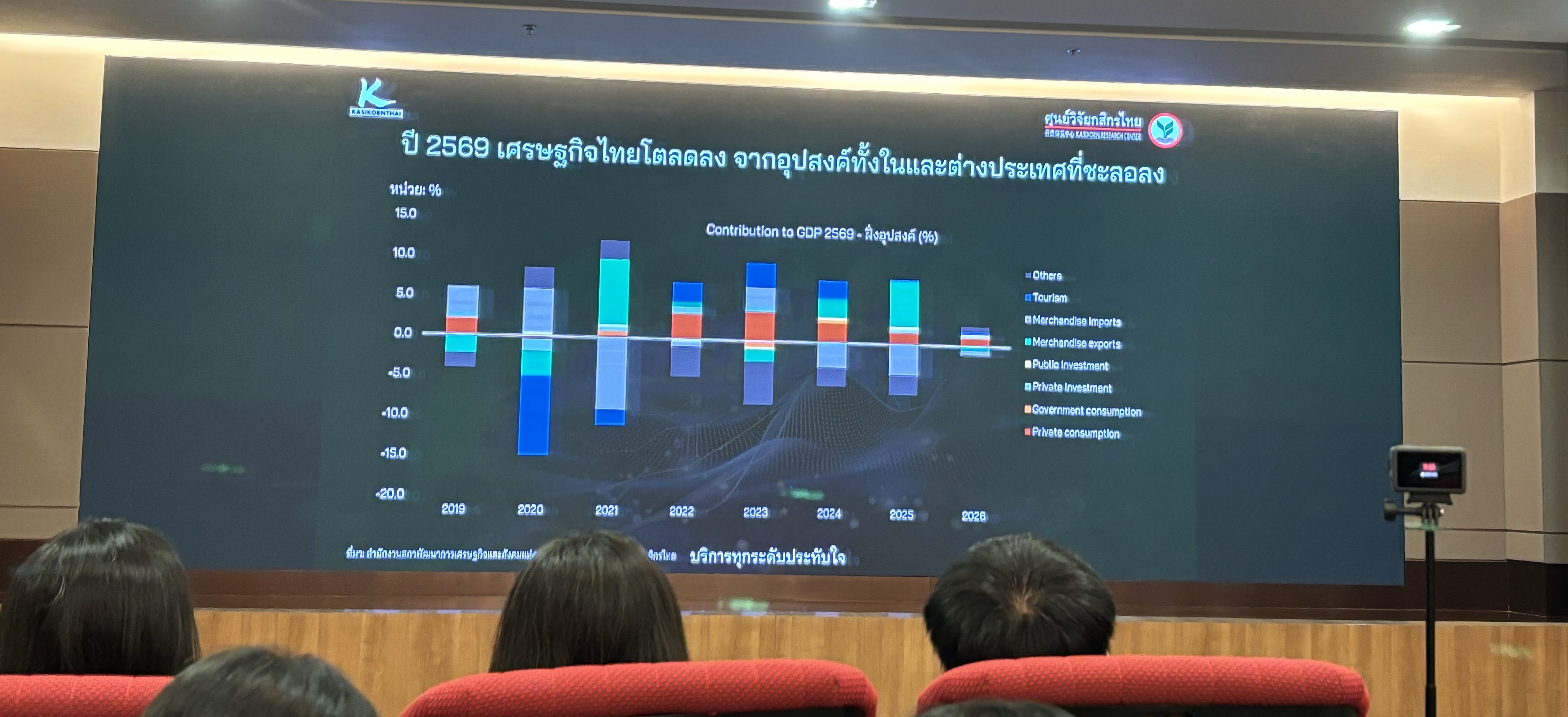 นางสาวณัฐพร ตรีรัตน์ศิริกุล รองกรรมการผู้จัดการ บริษัท ศูนย์วิจัยกสิกรไทย จำกัด ระบุว่า เศรษฐกิจไทยมีแนวโน้มชะลอลงในปี 2569 โดยศูนย์วิจัยกสิกรไทยคาดการณ์อัตราการเติบโตของเศรษฐกิจไทยปี 2569 ที่ 1.6% เทียบกับปี 2568 ที่คาดว่าจะขยายตัวที่ 2.0% โดยส่งออกสินค้าของไทยในปี 2569 คาดว่าจะหดตัวส่งผลทำให้แรงขับเคลื่อนที่สำคัญของเศรษฐกิจไทยลดลง การท่องเที่ยวที่จะยังฟื้นตัวกลับมาได้ไม่เต็มที่ ในขณะที่การบริโภคของครัวเรือนที่ยังเป็นแรงขับเคลื่อนหลักของเศรษฐกิจมีแนวโน้มชะลอลง ส่วนหนึ่งจากแรงหนุนจากการใช้จ่ายและมาตรการกระตุ้นเศรษฐกิจของภาครัฐอาจลดลงตามข้อจำกัดทางการคลัง โดยคาด กนง. ลดดอกเบี้ยนโยบายต่ออีก 1 ครั้ง ในปี 2569 นอกจากนี้ ยังต้องติดตามความไม่แน่นอนทางการเมือง โดยเฉพาะหลังการเลือกตั้งด้วยเช่นกัน