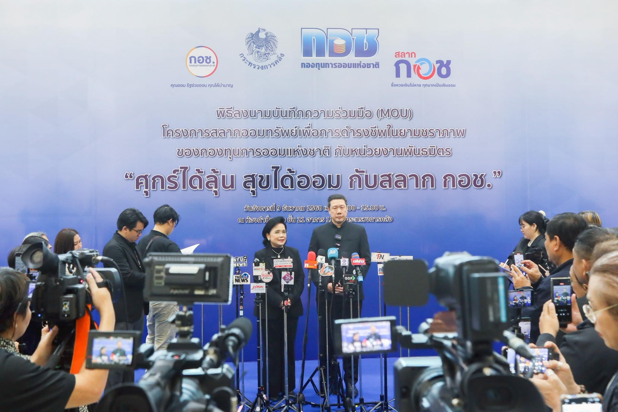 นายธีรลักษ์ แสงสนิท รองปลัดกระทรวงการคลัง ประธานกรรมการกองทุนการออมแห่งชาติ (กอช.) เป็นประธานพิธีลงนามบันทึกความร่วมมือ (MOU) โครงการสลากออมทรัพย์เพื่อการดำรงชีพในยามชราภาพของกองทุนการออมแห่งชาติ กับหน่วยงานพันธมิตร “ศุกร์ได้ลุ้น สุขได้ออม กับสลาก กอช.” โดยมีนางสาวจารุลักษณ์ เรืองสุวรรณ เลขาธิการคณะกรรมการกองทุนการออมแห่งชาติ กล่าวรายงาน ณ ห้องกำปั่นทอง ชั้น 21 อาคาร 150 ปี กระทรวงการคลัง เมื่อวันที่ 9 ธันวาคม 2568