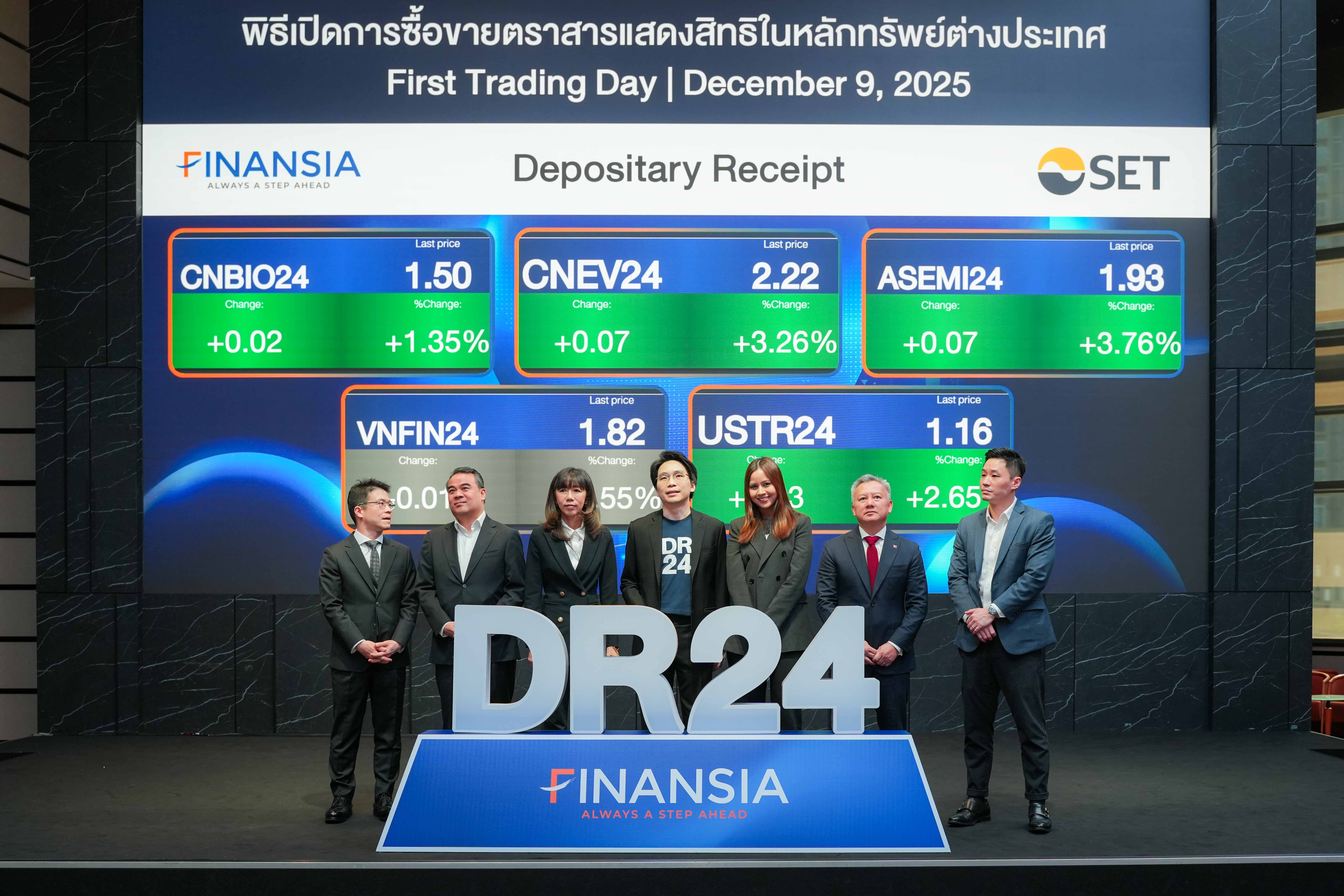 ดร.รินใจ ชาครพิพัฒน์ และ สรวิศ ไกรฤกษ์ รองผู้จัดการ ตลาดหลักทรัพย์แห่งประเทศไทย พร้อมด้วย ดร.จิติพล พฤกษาเมธานันท์ ประธานเจ้าหน้าที่ผลิตภัณฑ์ บริษัทหลักทรัพย์ ฟินันเซีย ไซรัส จำกัด (มหาชน) Mr. Thomas Nguyen, Chief Global Markets Officer, SSI Securities Vietnam และ Mr. Mitchell Lam, Intermediaries Business Development in HK & SEA, Mirae Asset Global Investments Hong Kong ร่วมพิธีเปิดการซื้อขายวันแรกในตลาดหลักทรัพย์ฯ ของ 5 DR อ้างอิงกองทุน ETF ฮ่องกง-เวียดนาม ได้แก่ ASEMI24, CNBIO24, CNEV24, USTR24 และ VNFIN24 ในวันที่ 9 ธ.ค. 2568 ผู้ลงทุนศึกษาข้อมูล DR ใหม่ได้ที่ www.fnsyrus.com หรือศึกษาผลิตภัณฑ์ DR เพิ่มเติมได้ที่ www.set.or.th/dr