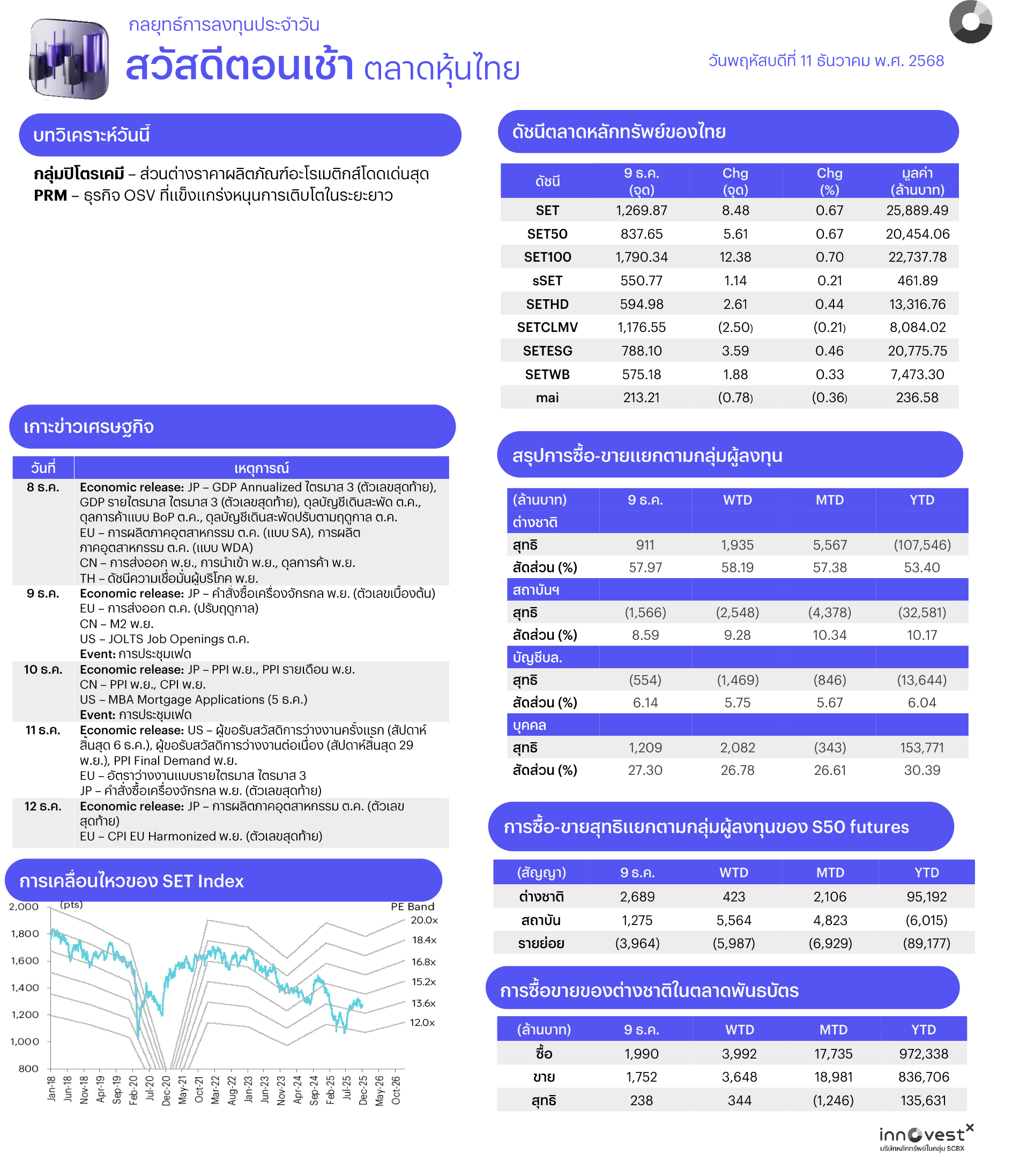 4. Trading Idea: นักลงทุนที่รับความเสี่ยงได้และต้องการเก็งกำไร แนะนำ 1) หุ้นที่คาดได้อานิสงส์บวกจากมีนโยบายภาครัฐหนุน อาทิ นโยบาย BOI Fast Pass แนะนำกลุ่มนิคม (WHA AMATA), นโยบายรนำร่องปลดล็อกช่วงเวลาห้ามขายเหล้าเบียร์ 14.00-17.00 น. เป็นเวลา 6 เดือน แนะนำกลุ่มค้าปลีก (CPALL BJC), นโยบายเพิ่มเงินสมทบประกันสังคม กลุ่มการแพทย์ (BCH CHG) และ 2) หุ้นที่คาดนำเข้าคำนวณ SET50 ในรอบ 1H69 ซึ่งจะประกาศกลาง ธ.ค. นี้ แนะนำ SAWAD ITC