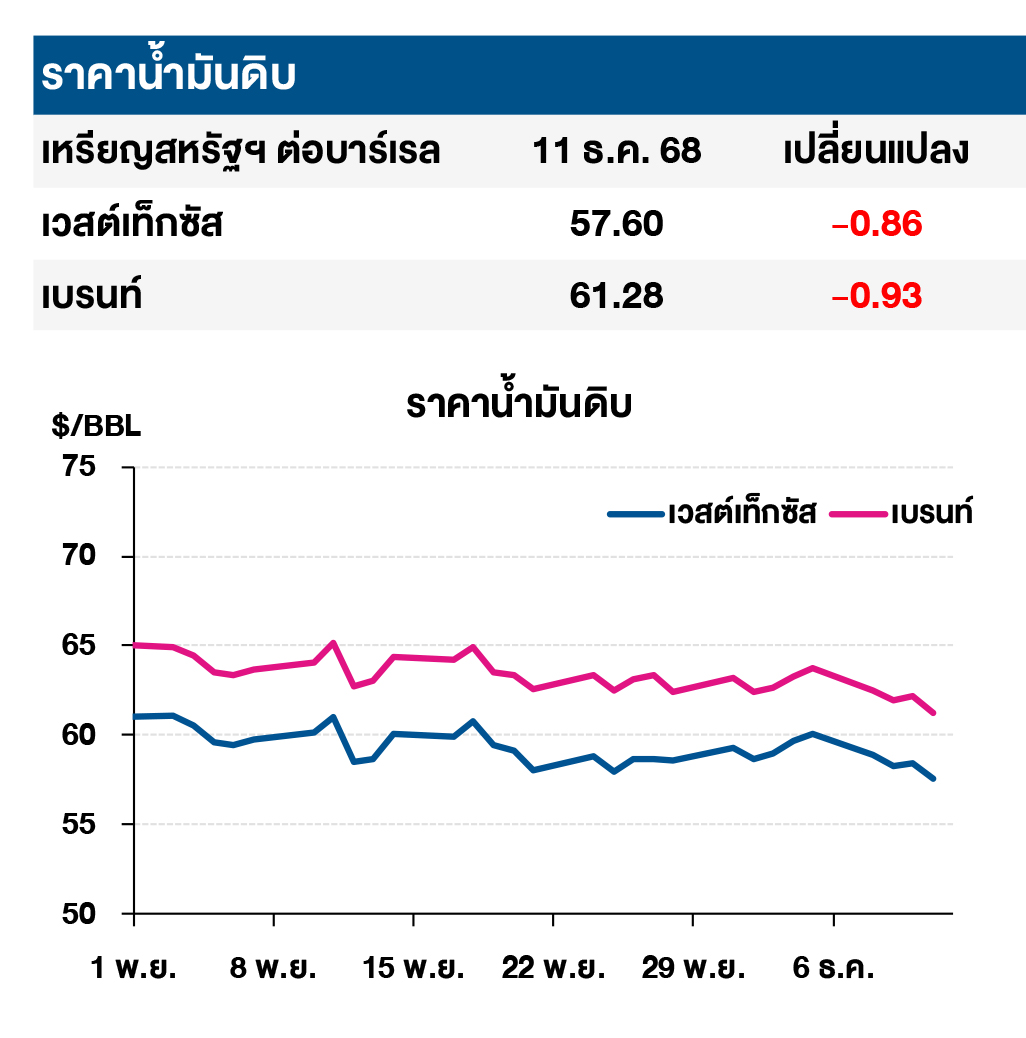 (-) ราคาน้ำมับดิบปรับลดลง หลังสำนักงานสารสนเทศด้านพลังงานสหรัฐฯ (EIA) เปิดเผยตัวเลขน้ำมันเบนซินคงคลังสหรัฐฯ ประจำสัปดาห์สิ้นสุด ณ วันที่ 5 ธ.ค. 68 ปรับเพิ่มขึ้น 6.4 ล้านบาร์เรล ซึ่งมากกว่าที่นักวิเคราะห์คาดการณ์ว่าจะปรับเพิ่มเพียง 2.8 ล้านบาร์เรล อีกทั้งตัวเลขน้ำมันดีเซลคงคลังสหรัฐฯ ประจำสัปดาห์สิ้นสุด ณ วันที่ 5 ธ.ค.68 ปรับเพิ่มขึ้น 2.5 ล้านบาร์เรล ซึ่งมากกว่า ที่นักวิเคราะห์คาดการณ์ไว้ว่าจะปรับเพิ่มเพียง 1.9 ล้านบาร์เรล สะท้อนสภาวะอุปทานน้ำมันเชื้อเพลิงล้นตลาด