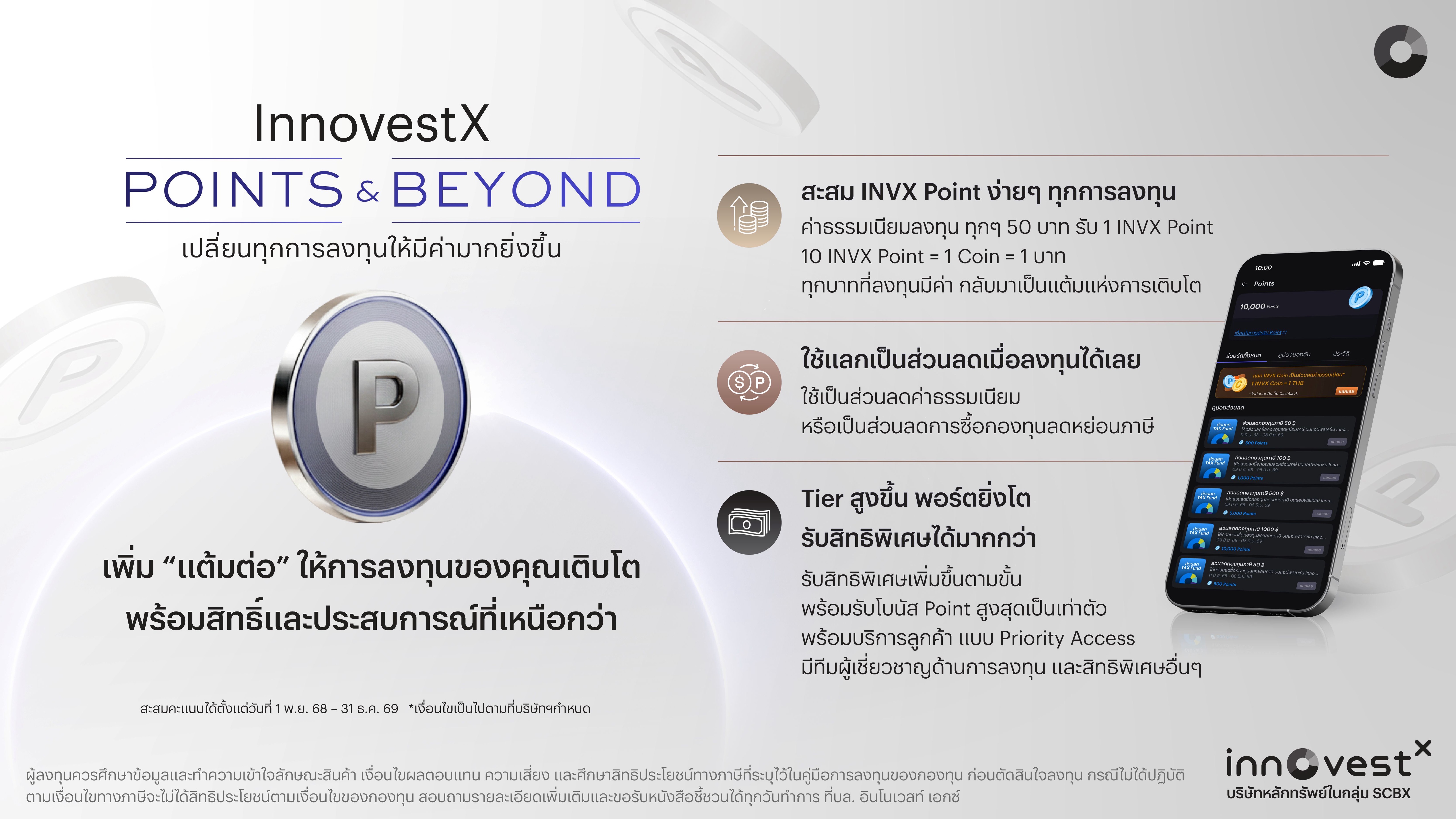 เพื่อเสริมประสบการณ์ลงทุนให้ก้าวไปอีกขั้น InnovestX ได้เปิดตัว “InnovestX Points & Beyond” สิทธิพิเศษสำหรับลูกค้า InnovestX ที่สามารถสะสมคะแนนจากทุกครั้งที่ซื้อหรือขาย เพื่อนำไปใช้เป็นส่วนลดค่าธรรมเนียมในการลงทุนครั้งถัดไป หรือนำไปใช้เป็นส่วนลดในการซื้อกองทุนลดหย่อนภาษี ให้ต่อยอดการลงทุนได้ไม่รู้จบ นอกจากนี้ ยังได้รับสิทธิ์การเข้าถึงบริการดูแลลูกค้า และกิจกรรมสัมมนาพิเศษด้านการลงทุน รวมถึงสิทธิประโยชน์อื่นๆ ในอนาคตตามระดับสมาชิก