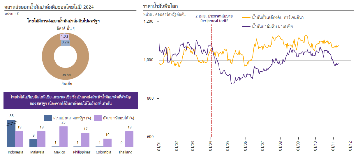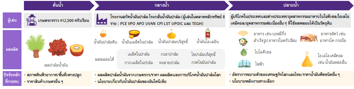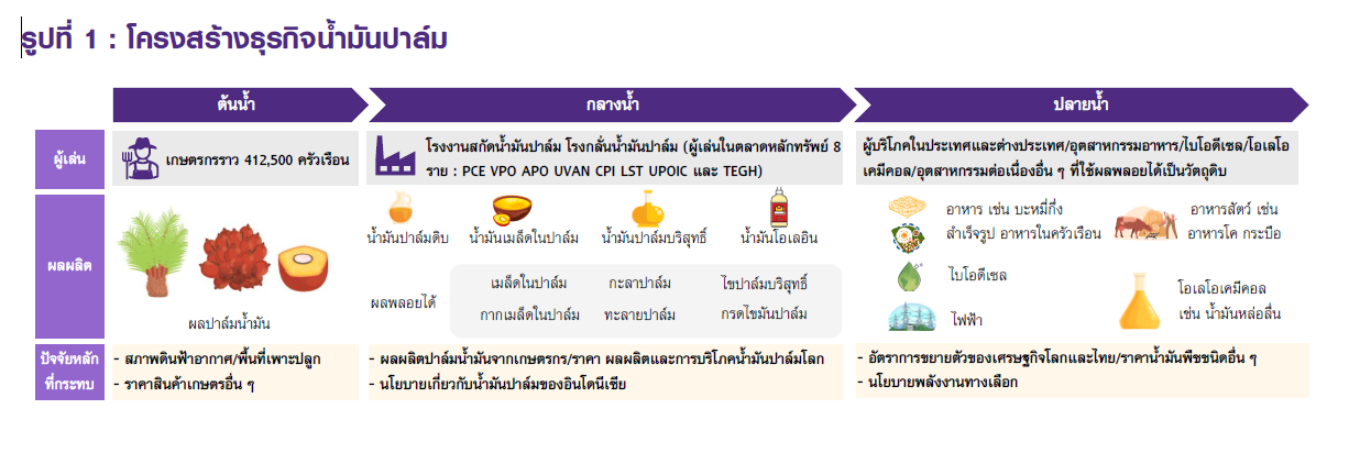 อุตสาหกรรมน้ำมันปาล์มเป็นอุตสาหกรรมแปรรูปสินค้าเกษตรที่สำคัญของไทย โดยอุตสาหกรรมนี้มีความเชื่อมโยงกับเกษตรกรต้นน้ำในระดับสูง เนื่องจากปริมาณผลปาล์มน้ำมันที่เกษตรกรเก็บเกี่ยวได้ จะกระทบต่อปริมาณผลผลิตน้ำมันปาล์มดิบที่โรงงานผลิตได้ ซึ่งในปี 2024 ไทยมีผลผลิตน้ำมันปาล์มดิบอยู่ที่ 3.3 ล้านตัน และมีสต็อกยกมาจากปี 2023 จำนวน 0.3 ล้านตัน คิดเป็นผลผลิตที่ได้รวม 3.6 ล้านตัน โดยผลผลิตที่ได้โดยส่วนใหญ่ราว 69.9% หรือ 2.5 ล้านตันจะใช้ในประเทศ ทั้งการนำไปกลั่นให้กลายเป็นน้ำมันปาล์มบริสุทธิ์และน้ำมันโอเลอินจำนวน 1.5 ล้านตัน (57.7% ของการใช้ในประเทศ) และการนำไปใช้ผลิตไบโอดีเซล 1.1 ล้านตัน (42.3% ของการใช้ในประเทศ) โดยน้ำมันปาล์มบริสุทธิ์จะถูกนำไปใช้เป็นน้ำมันทอดในอุตสาหกรรมอาหาร เช่น บะหมี่กึ่งสำเร็จรูป ส่วนน้ำมันโอเลอินจะถูกนำไปใช้บริโภคในภาคครัวเรือน โดยความต้องการบริโภคน้ำมันปาล์มในประเทศจะขึ้นอยู่กับภาวะเศรษฐกิจและส่วนต่างราคาน้ำมันปาล์มและราคาน้ำมันพืชชนิดอื่น ๆ เช่น ถั่วเหลือง ในขณะที่ความต้องการใช้ในอุตสาหกรรมไบโอดีเซลจะขึ้นอยู่กับนโยบายกำหนดสัดส่วนการผสมไบโอดีเซลของภาครัฐเป็นหลัก สำหรับผลผลิตที่ได้อีก 24.5% หรือ 0.9 ล้านตัน จะถูกใช้เพื่อส่งออก โดยในปี 2024 มูลค่าการส่งออกน้ำมันปาล์มดิบอยู่ที่ 26,297 ล้านบาท โดยมีสัดส่วนการส่งออกไปอินเดียคิดเป็น 98.8% ของมูลค่าการส่งออกทั้งหมด ซึ่งในการส่งออก ไทยจะต้องเผชิญการแข่งขันกับผู้ส่งออกรายใหญ่อย่างอินโดนีเซีย (ปี 2024 ส่งออก 22.3 ล้านตัน) และมาเลเซีย (ปี 2024 ส่งออก 16.5 ล้านตัน) ที่มีต้นทุนการผลิตต่ำกว่าไทย ทำให้ภาครัฐต้องอุดหนุนส่งออกน้ำมันปาล์มดิบ กิโลกรัมละ 2 บาท ในช่วงที่ผลผลิตเกินความต้องการบริโภคในประเทศจนทำให้ระดับสต็อกน้ำมันปาล์มดิบในประเทศสูงกว่า 0.3 ล้านตัน ทั้งนี้ผลผลิตที่ได้อีก 5.6% จะเหลือเก็บไว้เป็นสต็อกในประเทศ