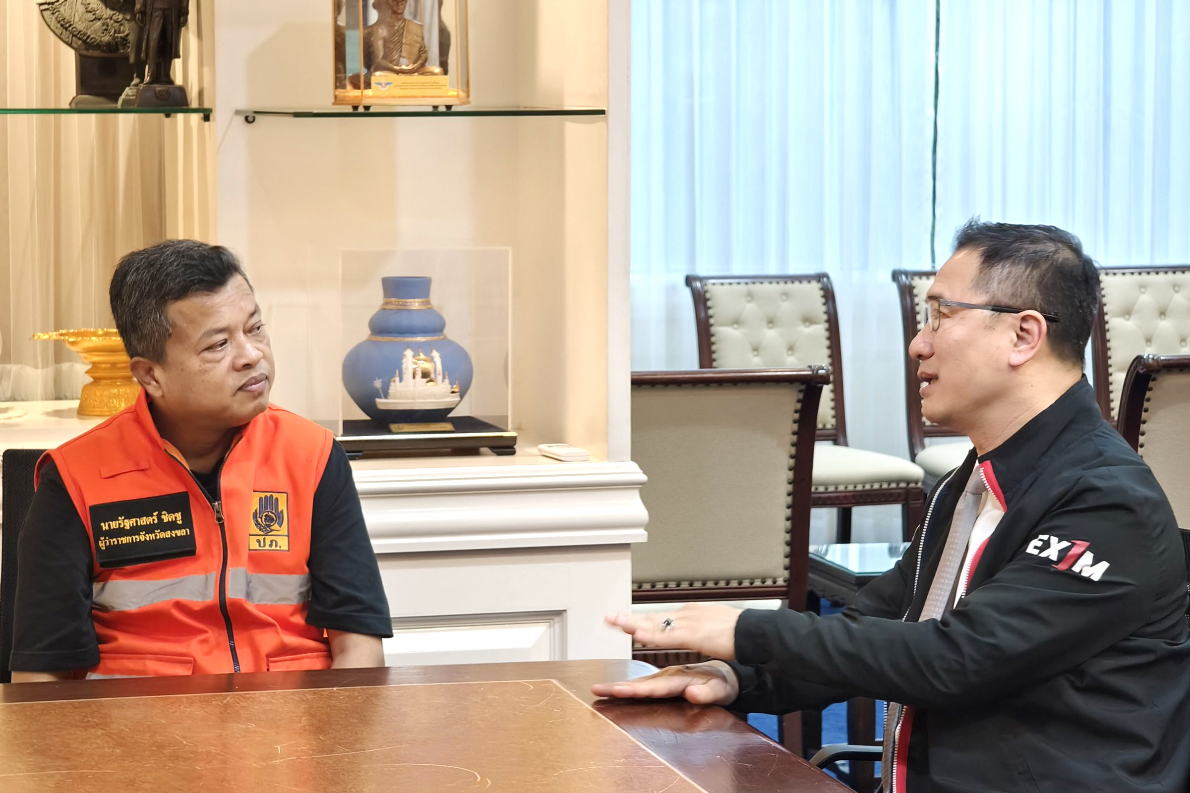 นายชลัช รัตนบุญนิธิ กรรมการผู้จัดการ ธนาคารเพื่อการส่งออกและนำเข้าแห่งประเทศไทย (EXIM BANK) พร้อมผู้บริหาร EXIM BANK เข้าพบนายรัฐศาสตร์ ชิดชอบ ผู้ว่าราชการจังหวัดสงขลา เพื่อสื่อสารและนำเสนอมาตรการของ EXIM BANK ในการเร่งฟื้นฟูและเยียวยาผู้ประกอบการที่ได้รับผลกระทบจากอุทกภัยในพื้นที่อำเภอหาดใหญ่ จังหวัดสงขลา อาทิ มาตรการทางการเงินและการพัฒนาศักยภาพผู้ประกอบการ ครอบคลุมการช่วยเหลือด้านสภาพคล่อง การเข้าถึงแหล่งเงินทุนเพื่อฟื้นฟูกิจการ ตลอดจนการสนับสนุนผู้ประกอบการที่มีศักยภาพในการขยายตลาดทั้งในและต่างประเทศ โดยมุ่งหวังให้ผู้ประกอบการสามารถกลับมาดำเนินธุรกิจได้อย่างเข้มแข็งและยั่งยืน โดยยืนยันความมุ่งมั่นของ EXIM BANK ในการทำงานร่วมกับหน่วยงานภาครัฐในระดับพื้นที่อย่างใกล้ชิด เพื่อสนับสนุนผู้ประกอบการไทยให้สามารถปรับตัว ฟื้นฟู และเติบโตได้อย่างยั่งยืน ขณะเดียวกัน ยังแลกเปลี่ยนข้อคิดเห็นเกี่ยวกับสภาพปัญหาและความต้องการของผู้ประกอบการในจังหวัดสงขลาและภาคใต้ เพื่อให้มาตรการช่วยเหลือสามารถตอบโจทย์สถานการณ์จริง และเกิดประโยชน์สูงสุดต่อการฟื้นฟูเศรษฐกิจภาคใต้ในระยะยาว ณ ศาลากลางจังหวัดสงขลา เมื่อวันที่ 12 ธันวาคม 2568