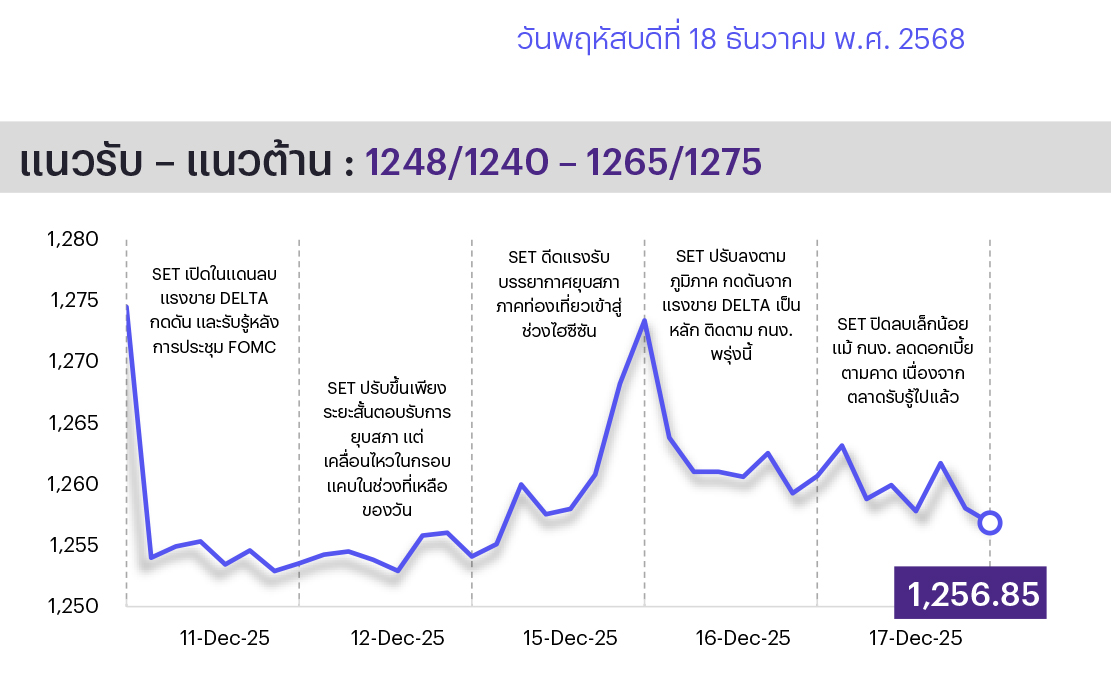 ช่วงสั้นมอง SET มีโอกาส Sideway Down จากกังวลสุญญากาศทางการเมืองไทย โดยมีแนวโน้มลงไปทดสอบฐานเดิมบริเวณ 1230 และมีกรอบบนจำกัดที่ 1285 โดยมีปัจจัยต่างประเทศที่ต้องติดตาม ได้แก่ การประชุมนโยบายการเงินของธนาคารกลางสำคัญ ได้แก่ BoJ (ตลาดคาดปรับขึ้นดอกเบี้ย 25bps สู่ 0.75%), BoE (ตลาดคาดดอกเบี้ยลง 25bps) และ BoE (ตลาดคาดจะยังคงดอกเบี้ยนโยบาย) ส่วน กนง. ได้ลดดอกเบี้ยนโยบายลง 25bps สู่ 1.25% และข้อมูลเศรษฐกิจสำคัญของสหรัฐฯ อาทิ เงินเฟ้อ พ.ย., PCE ต.ค. ส่วนปัจจัยในประเทศติดตามรายชื่อผู้สมัครและนโยบายหลักแต่ละพรรค หลัง กกต. ประกาศวันเลือกตั้งทั่วไปในวันที่ 8 ก.พ. 2569 ดังนั้นกลยุทธ์ลงทุนจึงแนะนำให้ “Selective Buy”