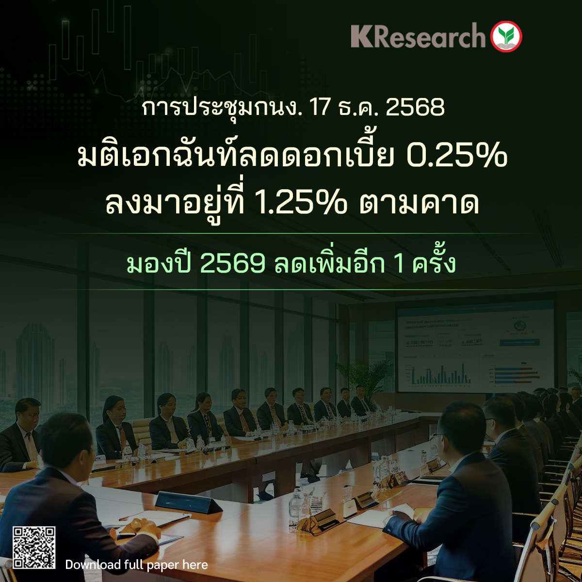 การประชุม กนง. วันที่ 17 ธ.ค. 2568 มีมติเอกฉันท์ ปรับลดดอกเบี้ยนโยบาย 0.25% ลงมาอยู่ที่ 1.25% ตามที่ศูนย์วิจัยกสิกรไทยคาดไว้ โดยแถลงการณ์รอบนี้มีประเด็นที่แตกต่างจากรอบก่อนหน้า ดังนี้