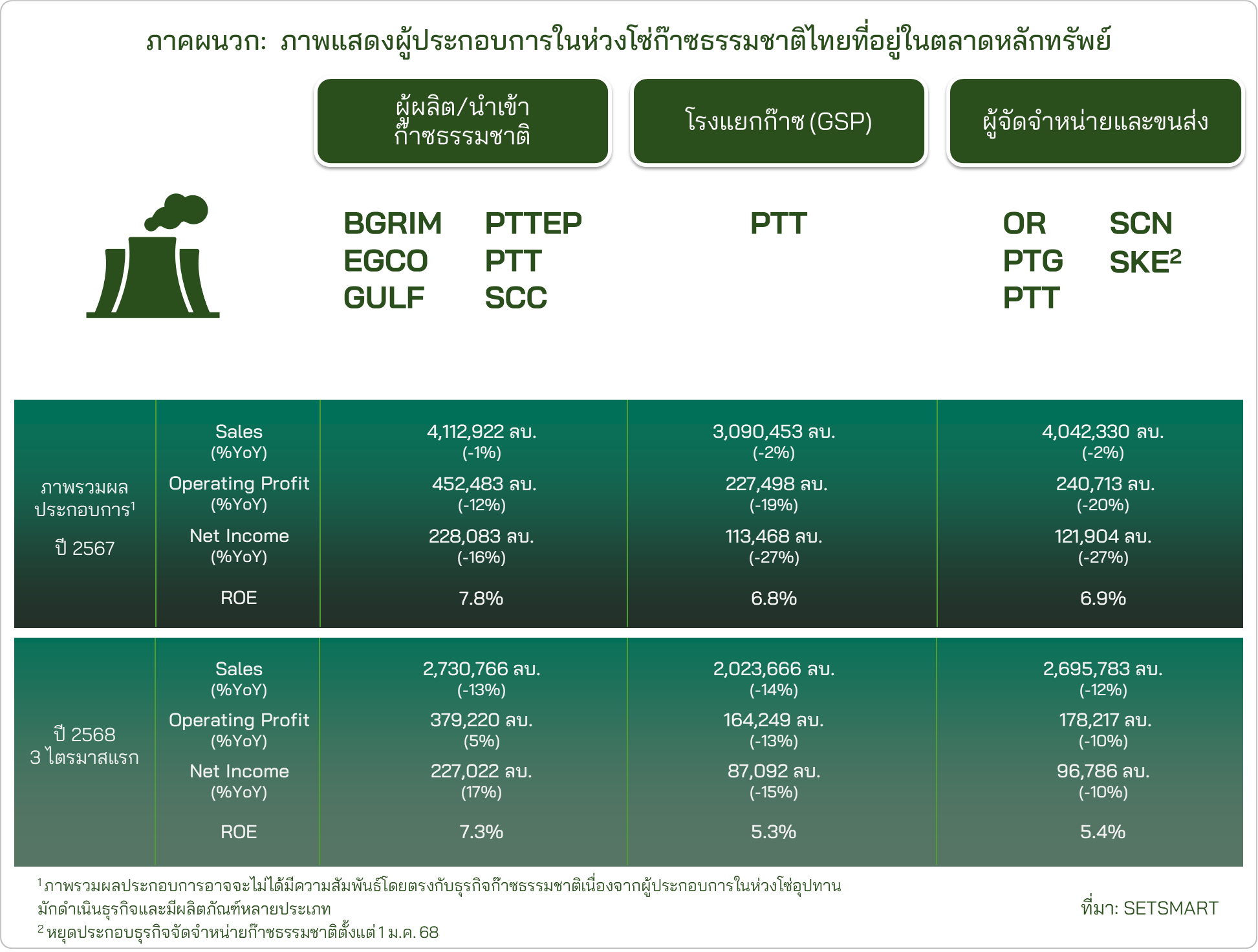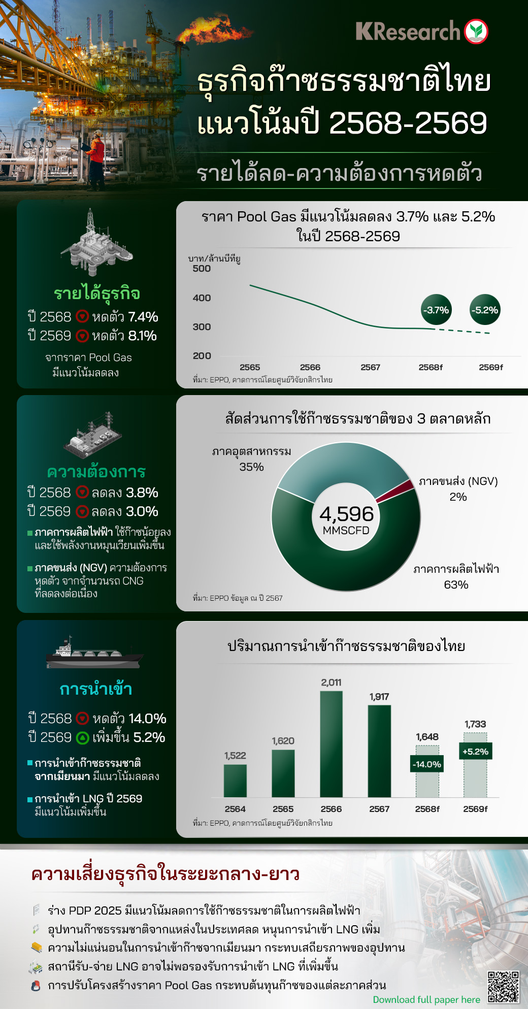 · รายได้ธุรกิจก๊าซธรรมชาติไทยคาดว่าจะลดลงในปี 2568 และ 2569 เพราะราคา Pool Gas และความต้องการก๊าซธรรมชาติมีแนวโน้มหดตัว ทั้งนี้ ราคา Pool Gas คาดว่าจะลดลง 3.7% และ 5.2% ตามทิศทางขาลงของราคาก๊าซธรรมชาติจากอ่าวไทย