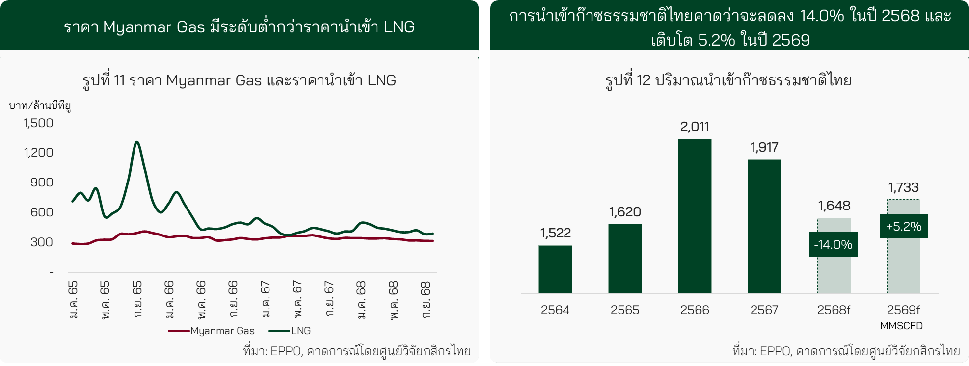 เพราะต้นทุนที่เพิ่มขึ้นตามราคานำเข้าก๊าซเฉลี่ยที่มีแนวโน้มสูงขึ้นจากการนำเข้า LNG เพื่อแทนแหล่งก๊าซจากเมียนมาที่มีต้นทุนต่ำกว่า แต่กำลังเผชิญภาวะอุปทานตึงตัว (รูปที่ 11)