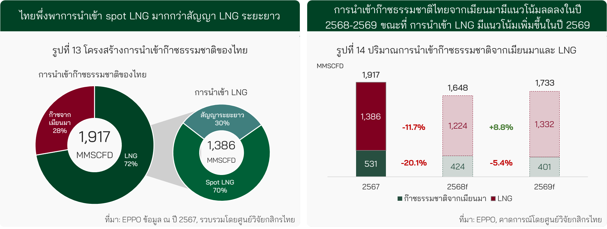 ทั้งนี้ การนำเข้า LNG 70% เป็น spot LNG5 ในขณะที่ ส่วนที่เหลือเป็นสัญญาระยะยาว ซึ่งปัจจุบันมีเพียงสัญญากับกาตาร์และมาเลเซีย6 (รูปที่ 13) สาเหตุที่ไทยพึ่งพา spot LNG ในสัดส่วนสูง มาจากการนำเข้าก๊าซจากเมียนมาที่มีแนวโน้มลดลง ประกอบกับการเจรจาทำสัญญา LNG ระยะยาวที่มักใช้เวลาราว 2-3 ปี โดยสัญญาล่าสุดคือการนำเข้า LNG จากสหรัฐฯ ซึ่งจะเริ่มในปี 2569