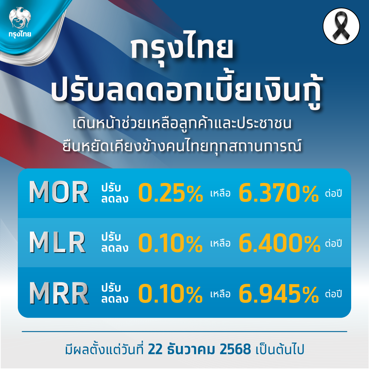 ธนาคารกรุงไทย ประกาศปรับลดอัตราดอกเบี้ยเงินกู้สูงสุด 0.25% ต่อปี เพื่อช่วยบรรเทาภาระทางการเงินให้แก่ประชาชนและภาคธุรกิจ ท่ามกลางสถานการณ์เศรษฐกิจไทยที่มีแนวโน้มชะลอตัวอย่างชัดเจน โดยมีผลตั้งแต่วันที่ 22 ธันวาคม 2568 เป็นต้นไป สะท้อนบทบาทของธนาคารที่ยืนหยัดเคียงข้างลูกค้าในทุกช่วงเวลา