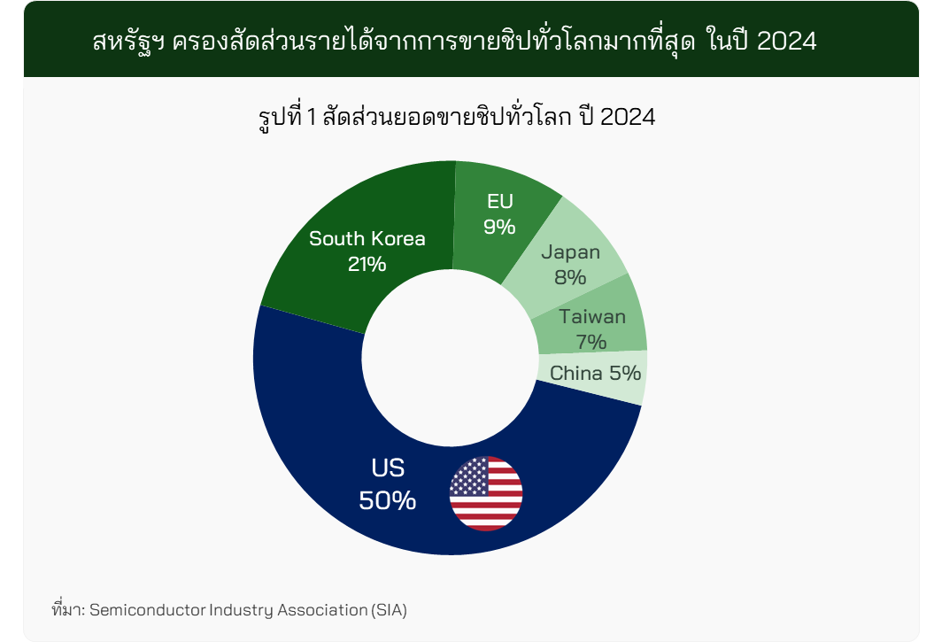 ปัจจุบัน สหรัฐฯ ยังคงเป็นผู้นำในอุตสาหกรรมชิปโลก โดยในปี 2024 ชิปจากบริษัทสหรัฐฯ มีสัดส่วนราวครึ่งหนึ่งของยอดขายทั่วโลก (รูปที่ 1)
