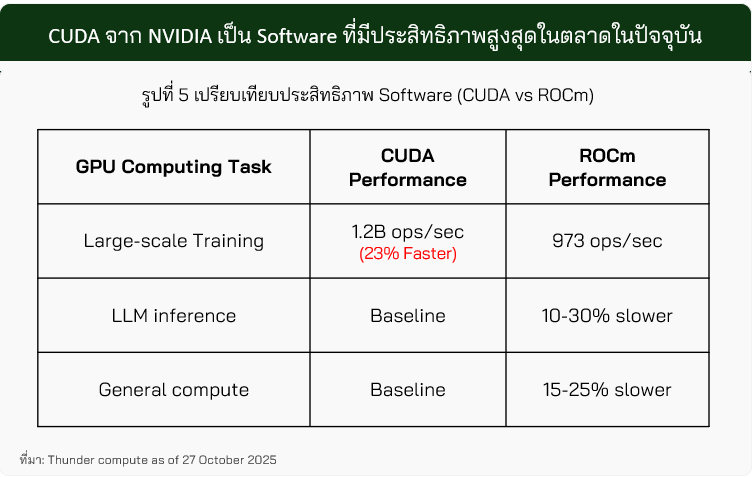 เมื่อเปรียบเทียบประสิทธิภาพซอฟต์แวร์ของ NVIDIA กับคู่แข่งโดยตรงอย่าง ROCm ของ AMD (รูปที่ 5) จะพบว่า CUDA ยังคงทำงานได้รวดเร็วกว่าและมีประสิทธิภาพสูงกว่าในแทบทุกประเภทของงานประมวลผล ที่ใช้ในงานด้าน AI เช่น Training, Inference, Parallel Computing และ Optimization Workloads