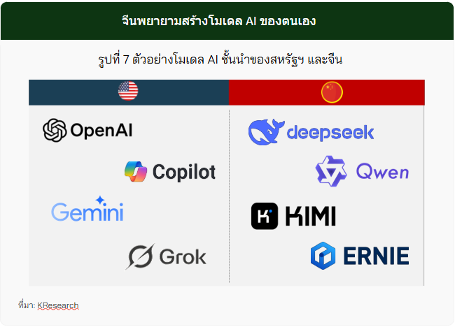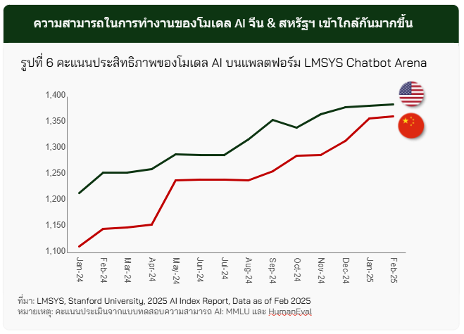 · อย่างไรก็ดี ภายใต้ข้อจำกัดด้านโครงสร้างพื้นฐานจีนกลับสามารถพัฒนาโมเดล AI ที่มีความฉลาดเทียบเท่ากับสหรัฐฯ สะท้อนถึงศักยภาพในการพัฒนาเทคโนโลยีภายในประเทศและความก้าวหน้าอย่างรวดเร็วในช่วงไม่กี่ปีที่ผ่านมา